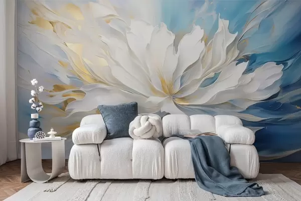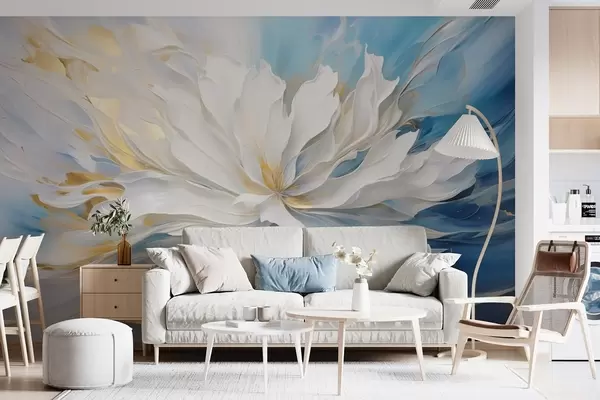 Murais de parede Grande peônia branca em estilo pintura a óleo sobre fundo azul-amarelo Nr. w09511