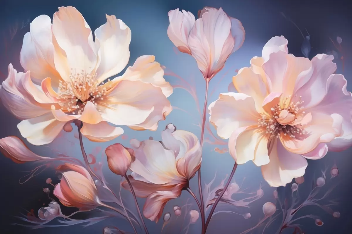 Murais de parede Peônias em tons de rosa claro e creme, em estilo aquarela, sobre um fundo azul profundo Nr. w09513