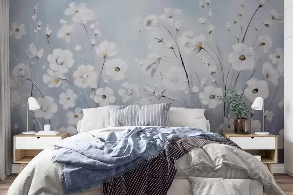 Murais de parede Flores brancas contra um céu azul em estilo pintura a óleo Nr. w09516