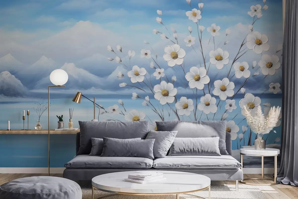 Murais de parede Flores brancas da primavera junto a um lago gelado com montanhas nevadas em estilo pintura a óleo Nr. w09526