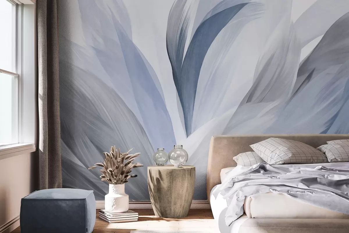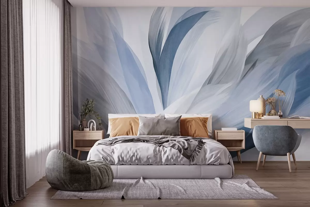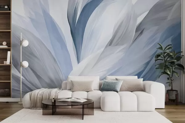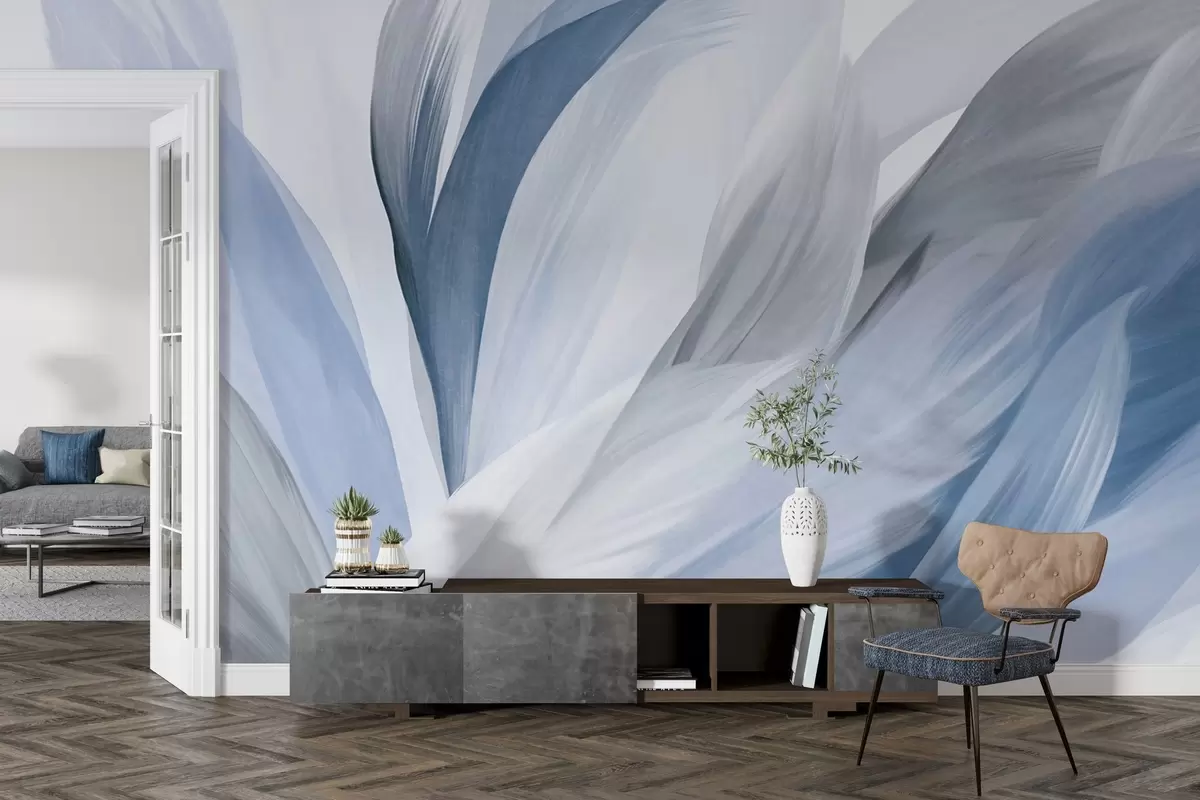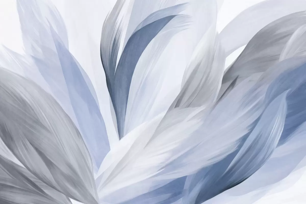 Murais de parede Penas abstratas texturizadas em azul, branco e cinza e vários tons, sobrepostas em um fundo branco Nr. w09531v1