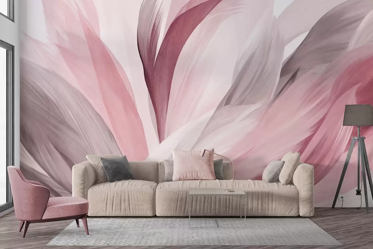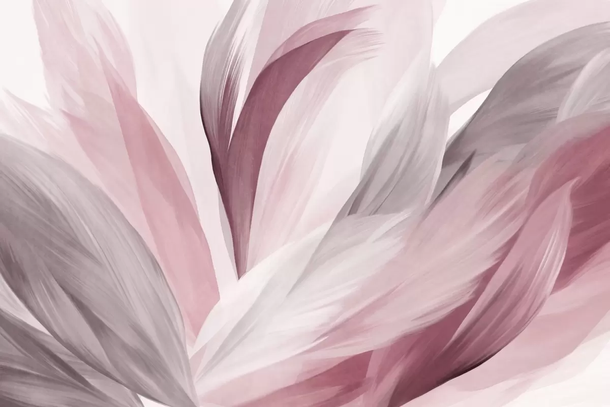 Murais de parede Penas abstratas texturizadas em rosa, branco e cinza e vários tons, sobrepostas em um fundo branco Nr. w09531v2