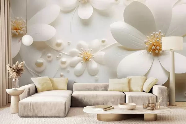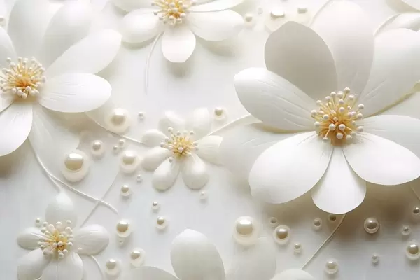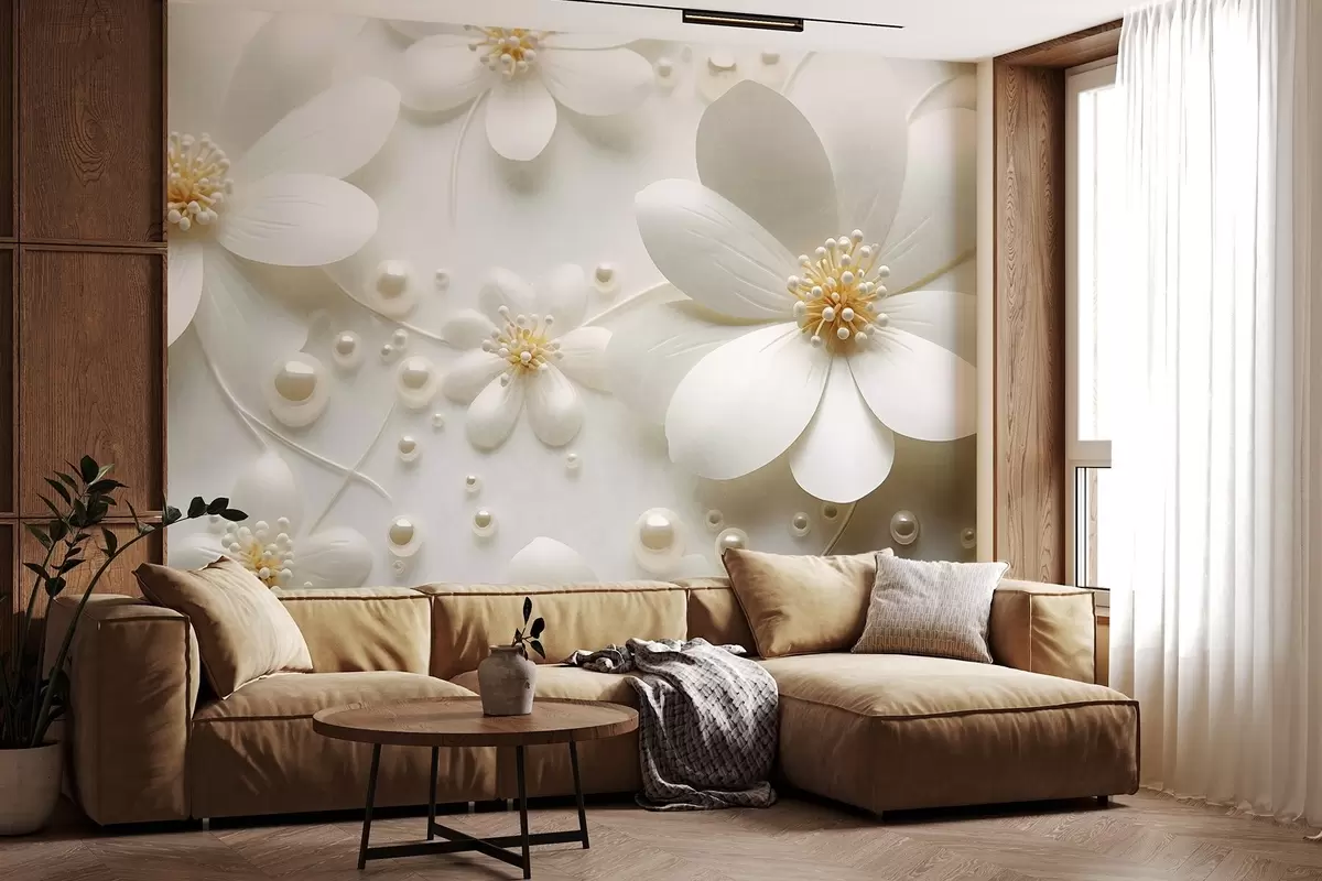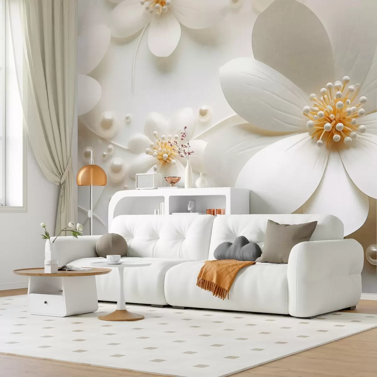 Murais de parede Flores brancas com pérolas espalhadas sobre um fundo branco, design elegante e minimalista, texturizado Nr. w09535