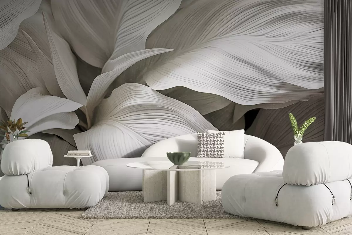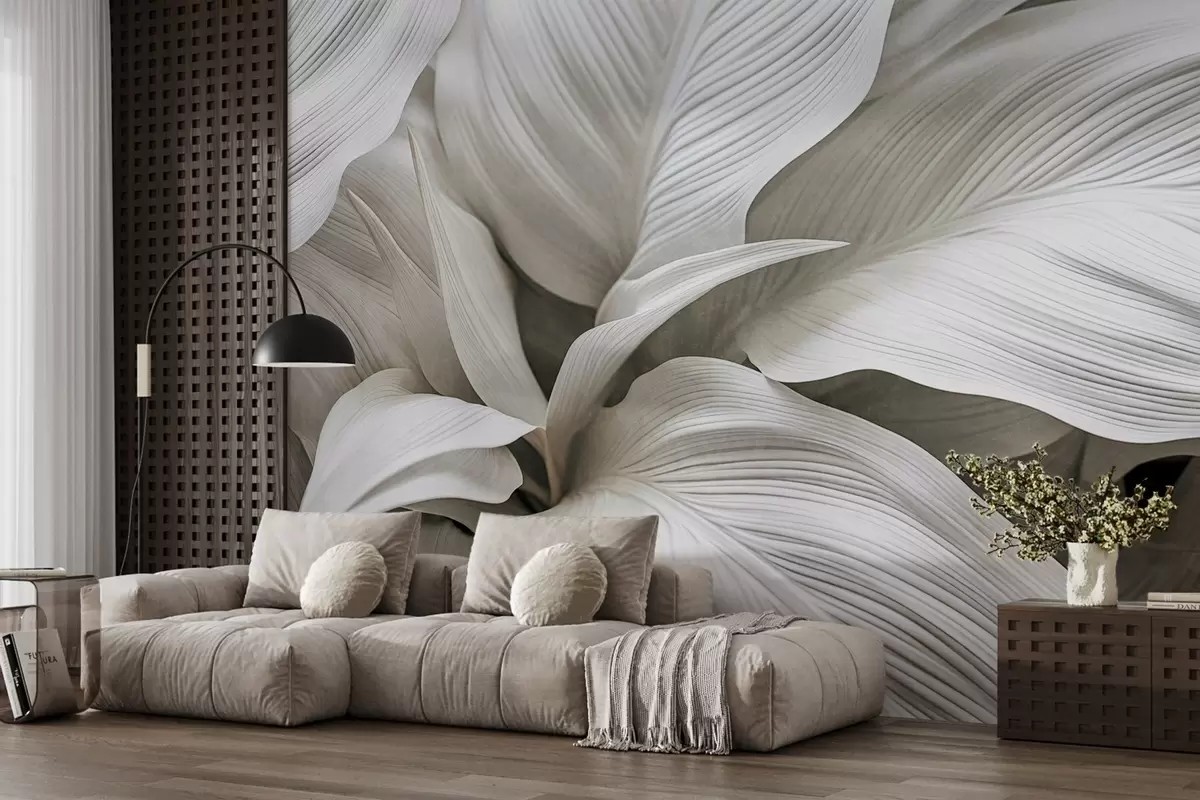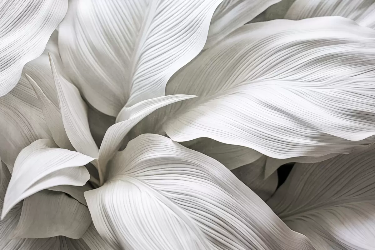 Murais de parede Folhas brancas grandes e texturizadas com veias proeminentes, sobrepostas e criando profundidade Nr. w09536