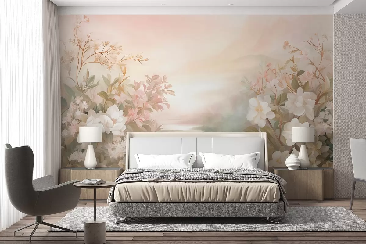 murais de parede Uma paisagem com um rio rodeado por flores e plantas, cores suaves, céu rosa, estilo texturizado em aquarela. w09537