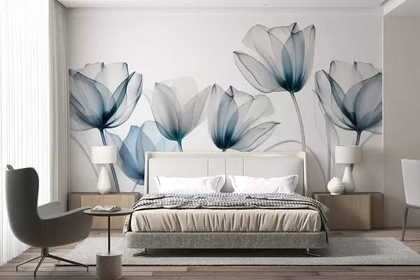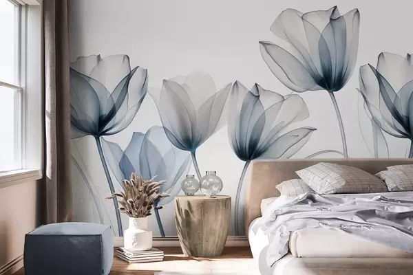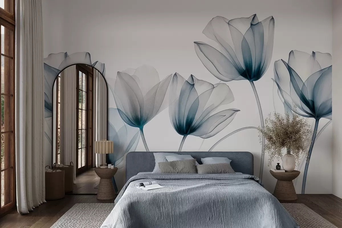 Murais de parede Flores de tulipa translúcidas azuis e brancas com hastes longas, contra um fundo claro, arte floral delicada e texturizada Nr. w09538
