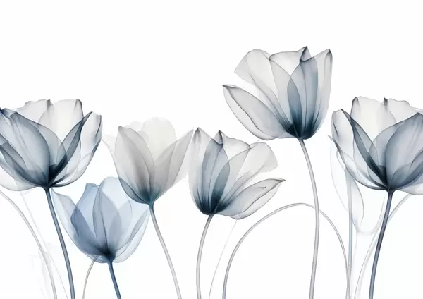 Murais de parede Flores de tulipa translúcidas azuis e brancas com hastes longas, contra um fundo claro, arte floral delicada e texturizada Nr. w09538
