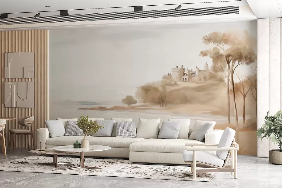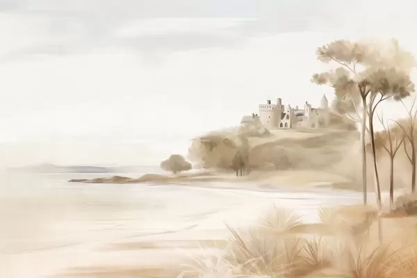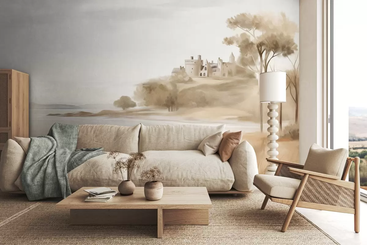Murais de parede Paisagem com um castelo em uma colina perto do mar, uma praia de areia em primeiro plano, cores suaves, arte texturizada Nr. w09540