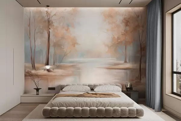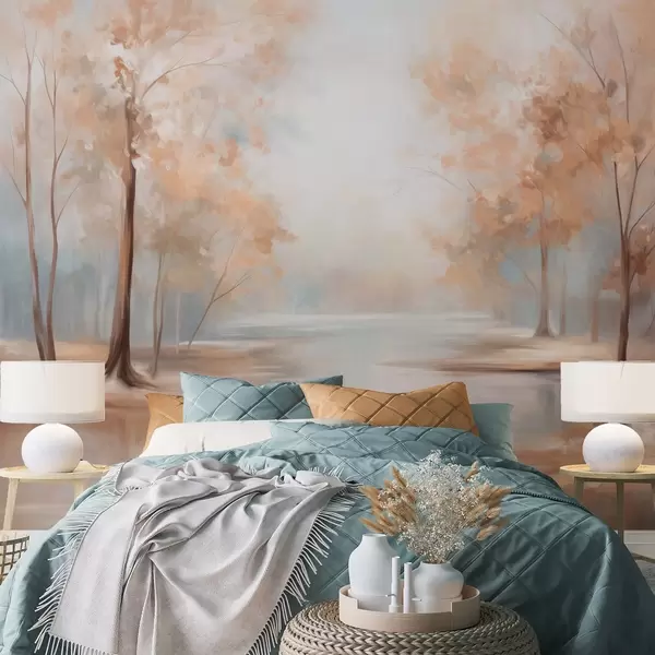 Murais de parede Paisagem outonal texturizada com árvores e um rio, cores suaves, atmosfera leve e arejada, cena pacífica e tranquila Nr. w09541
