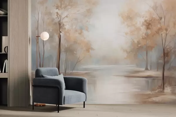 Murais de parede Paisagem outonal texturizada com árvores e um rio, cores suaves, atmosfera leve e arejada, cena pacífica e tranquila Nr. w09541