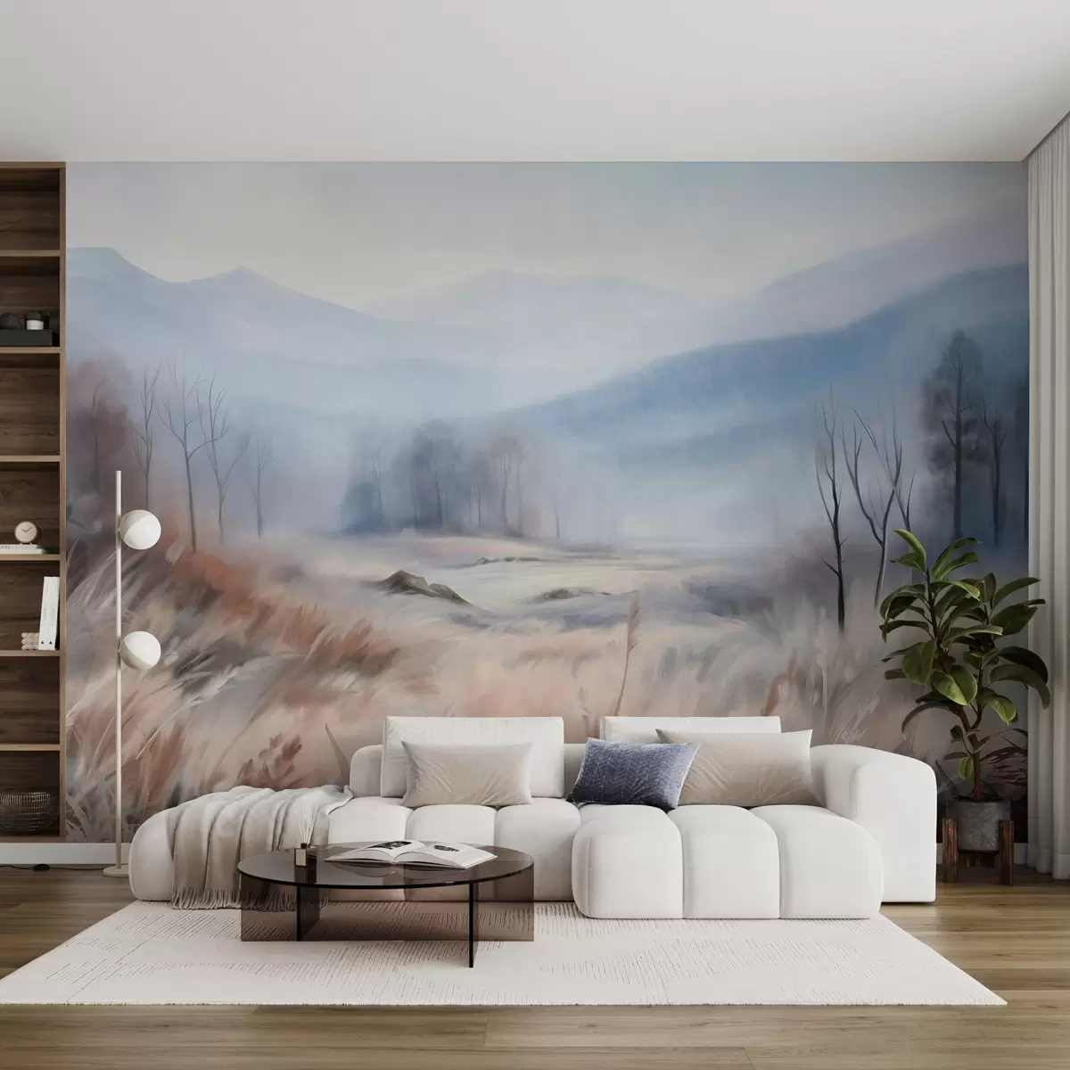 Murais de parede Paisagem texturizada com grama seca em primeiro plano e árvores ao fundo, com montanhas distantes Nr. w09542