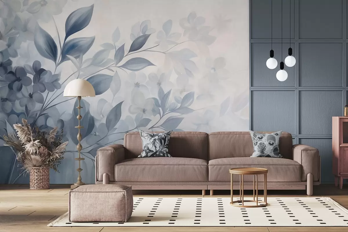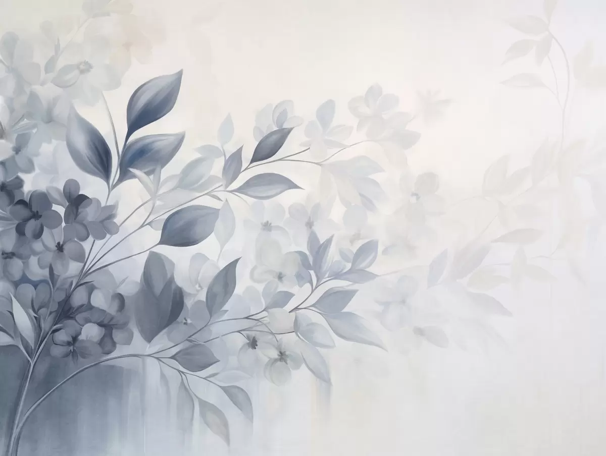 Murais de parede Ramo azul e branco texturizado com flores e folhas esmaecendo em um fundo claro, em estilo aquarela. Nr. w09543