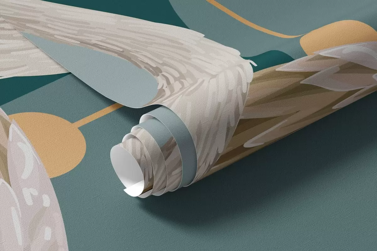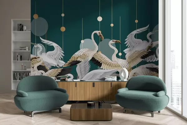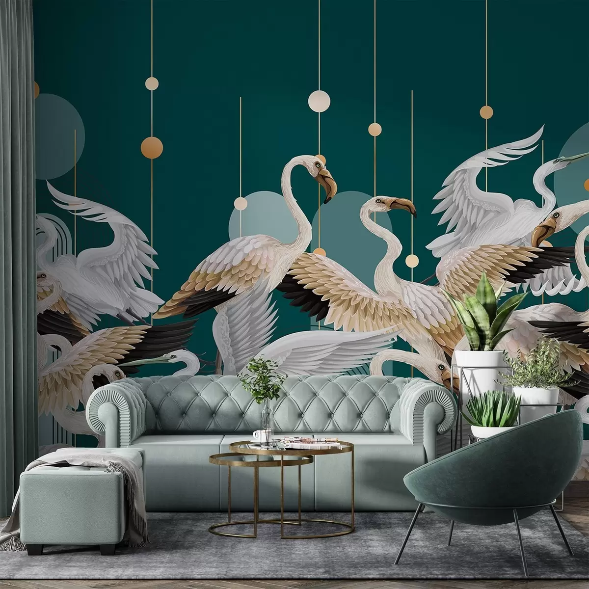 Murais de parede Um bando de flamingos brancos com asas delicadas, contra um fundo azul-petróleo escuro com linhas e círculos amarelos. Nr. w09546