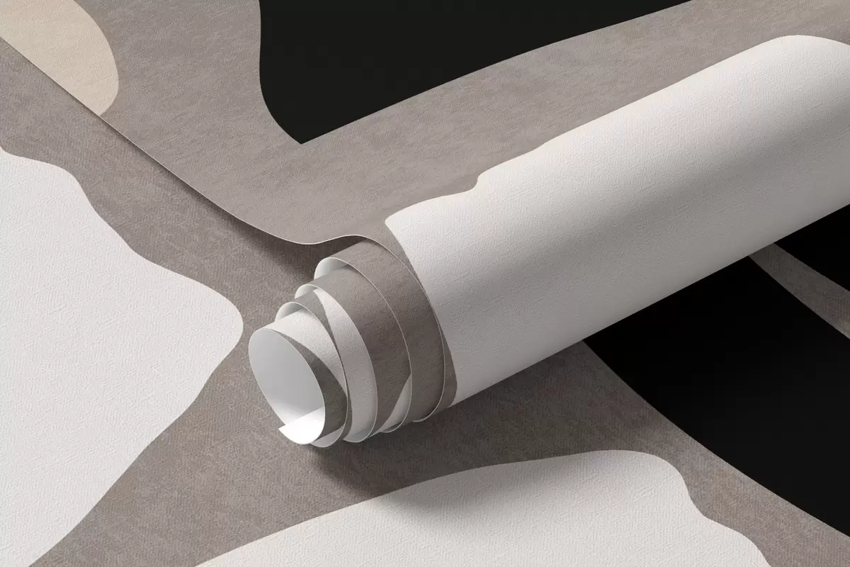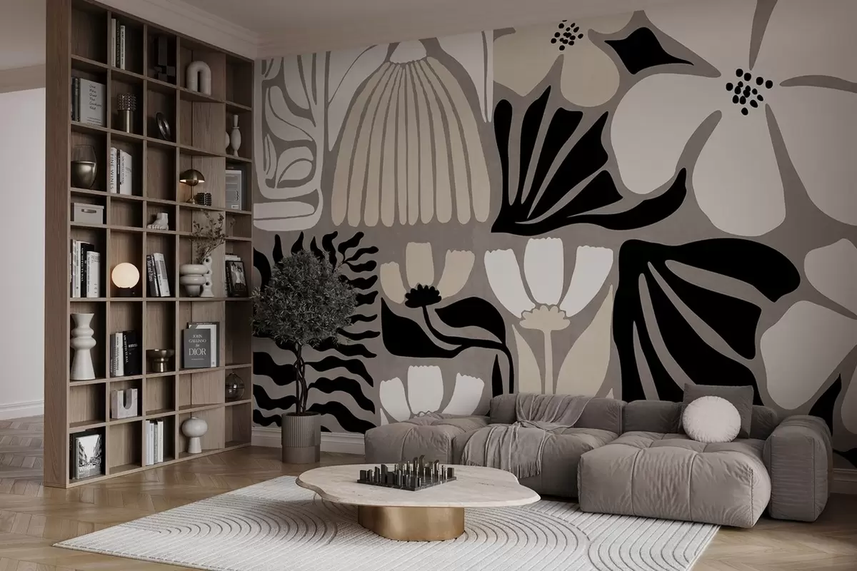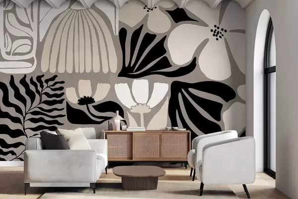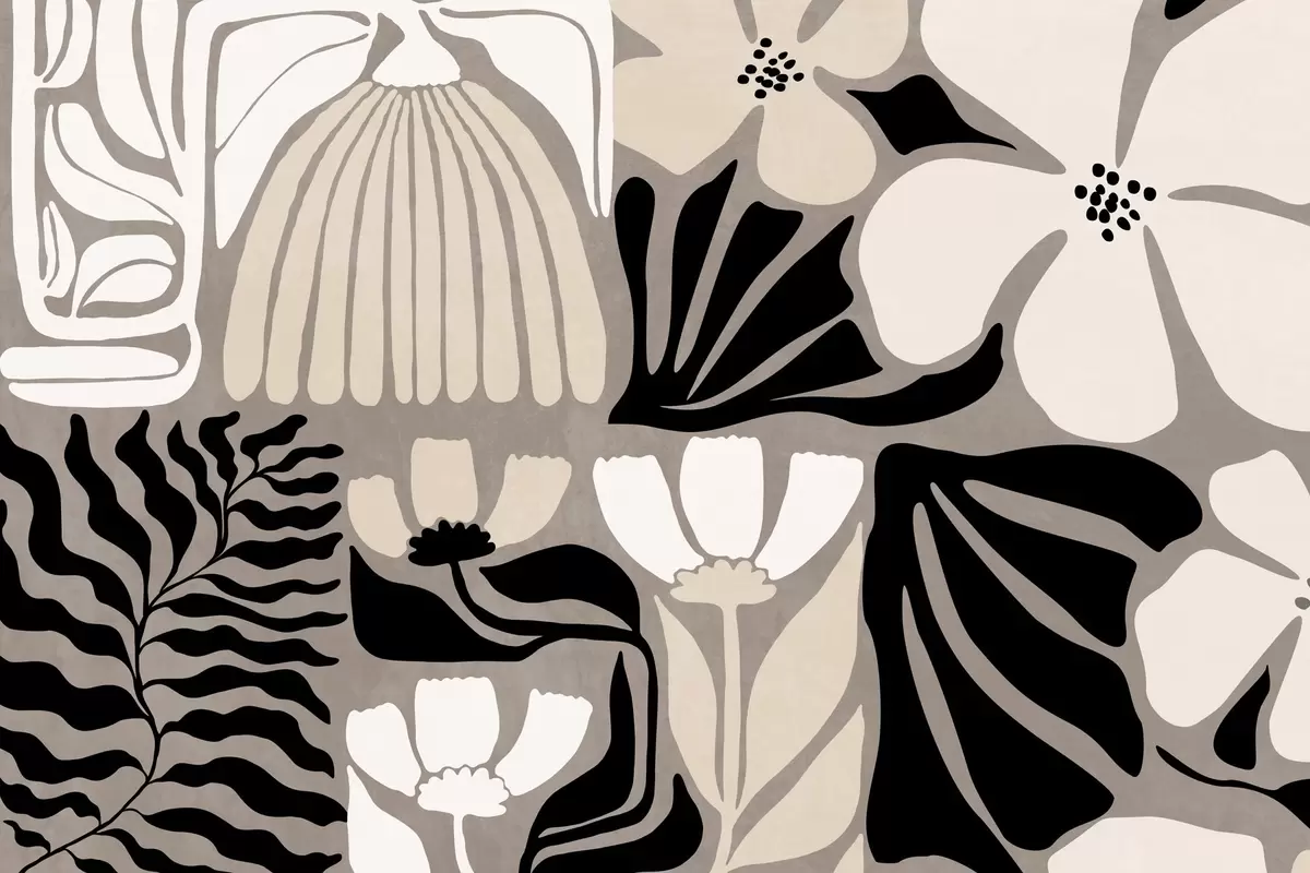 Murais de parede Flores e folhas minimalistas modernas em bege, preto e branco, texturizadas sobre um fundo cinza Nr. w09547