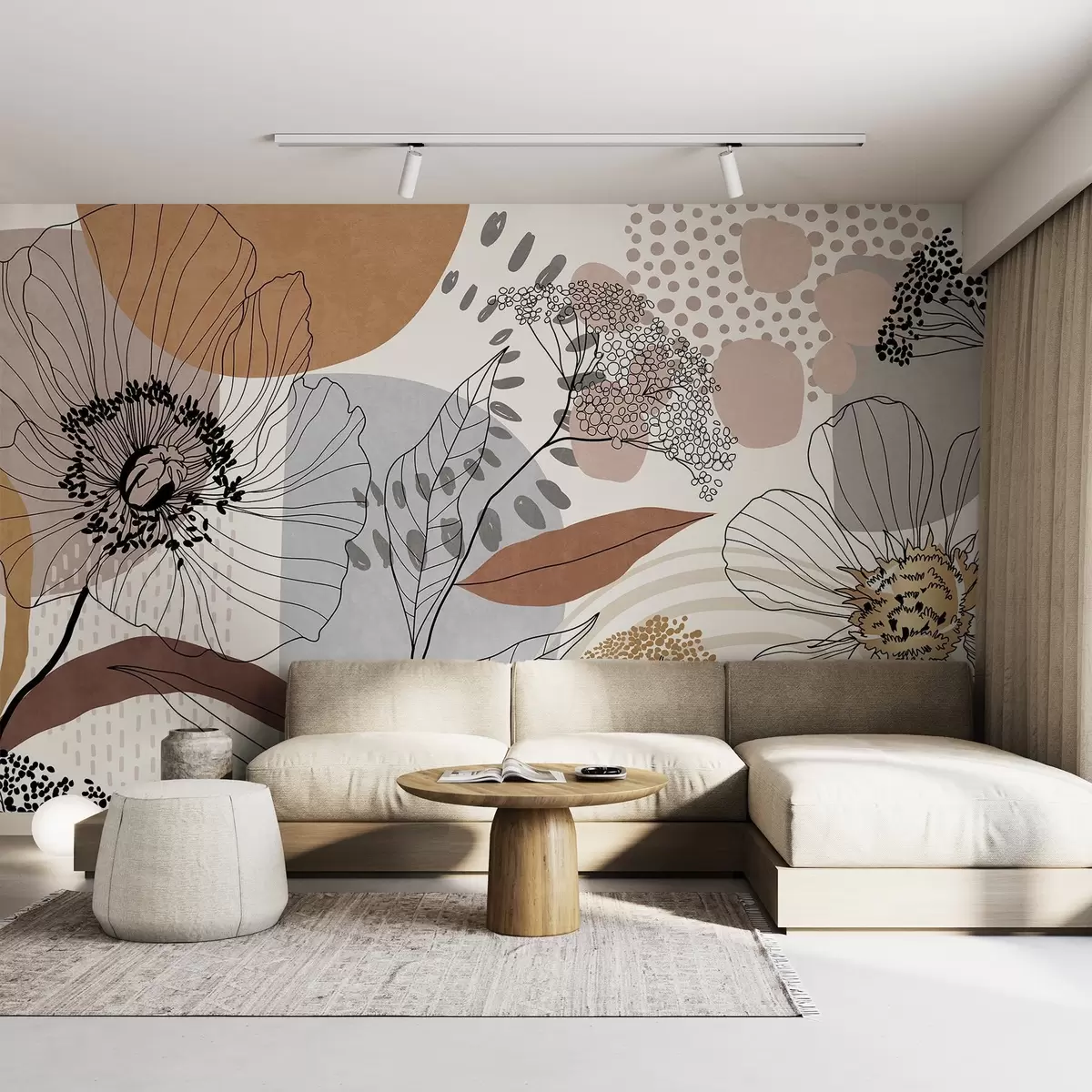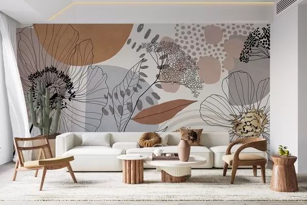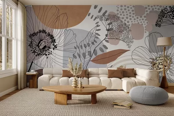 Murais de parede Estampa floral abstrata com flores, folhas e formas orgânicas em tons suaves de marrom, bege e cinza. Nr. w09548