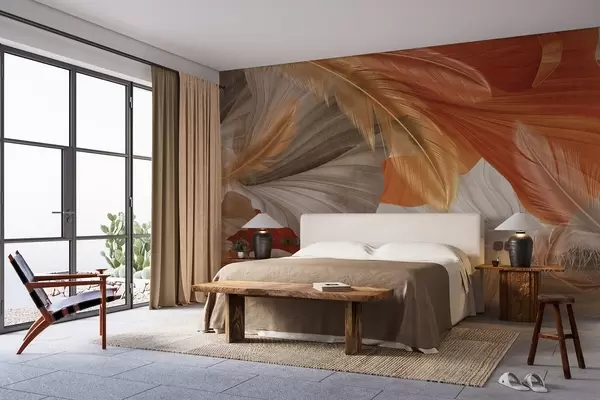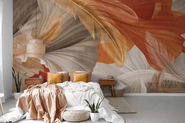 Murais de parede Formas abstratas texturizadas e fluidas em tons creme e ferrugem com delicadas penas amarelas, bege e marrons Nr. w09549