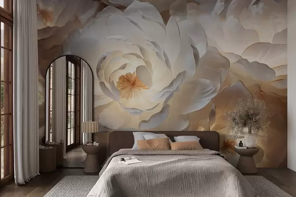 Murais de parede Grandes flores brancas de peônia fantasia com centros amarelos, iluminação suave e pétalas delicadas e texturizadas em camadas Nr. w09550