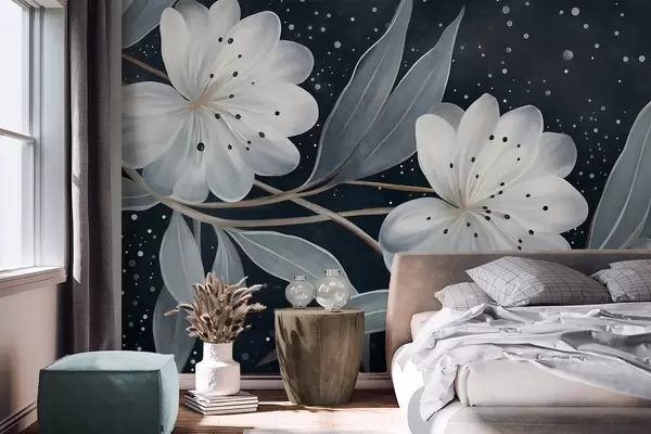 Murais de parede Flores brancas com textura fantasiosa, rodeadas por folhas e galhos azul-esverdeados contra um fundo escuro Nr. w09551