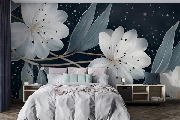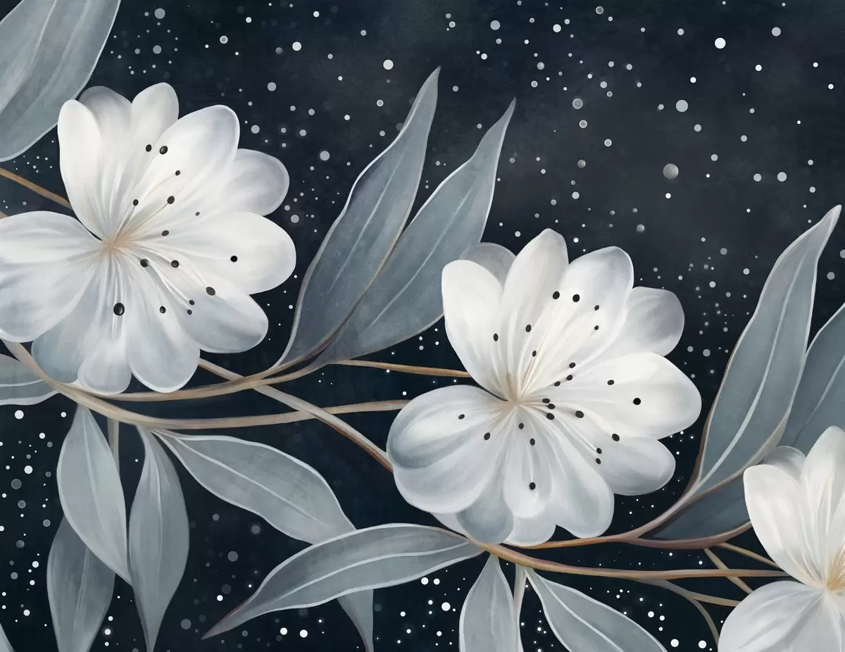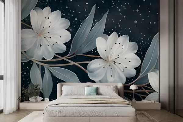Murais de parede Flores brancas com textura fantasiosa, rodeadas por folhas e galhos azul-esverdeados contra um fundo escuro Nr. w09551