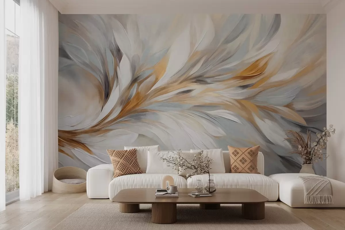 Murais de parede Estilo de pintura abstrata com pinceladas texturizadas em branco, amarelo e cinza, com um fundo suave e claro. Nr. w09552