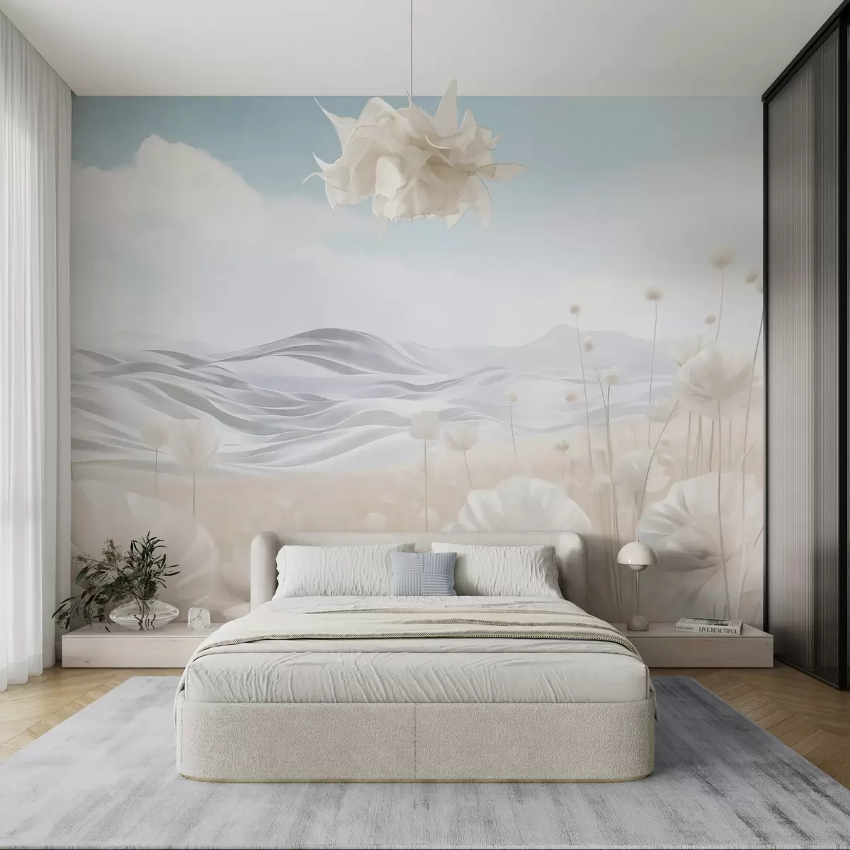 Murais de parede Campo texturizado de papoulas cremosas com colinas ondulantes sob um céu azul claro com nuvens suaves, cores pastel Nr. w09553