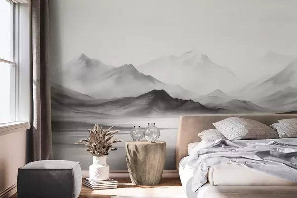 Murais de parede Uma paisagem monocromática texturizada com montanhas enevoadas e um lago em primeiro plano Nr. w09555