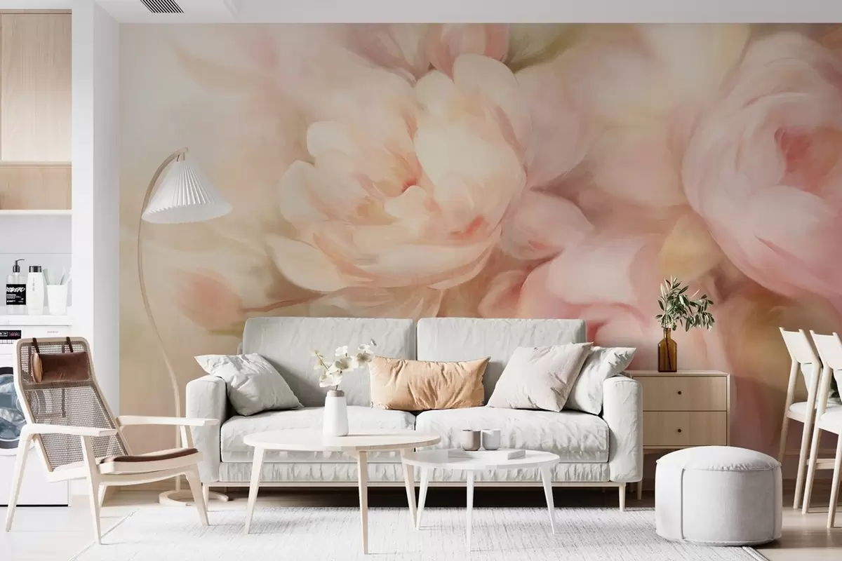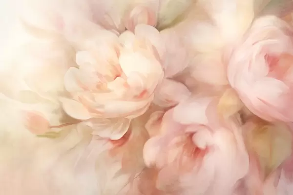 Murais de parede Peônias em tons suaves de rosa pálido e creme com pinceladas suaves e pictóricas, criando um arranjo floral texturizado. Nr. w09556