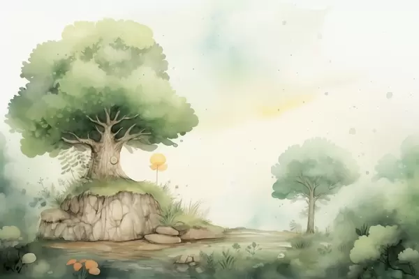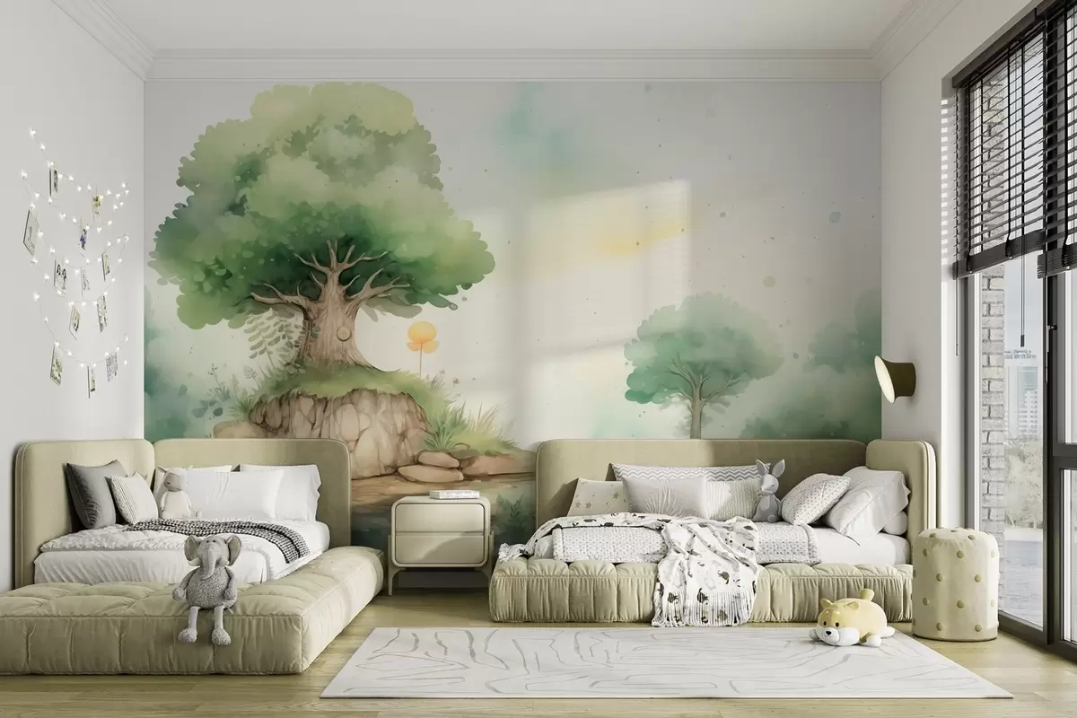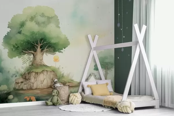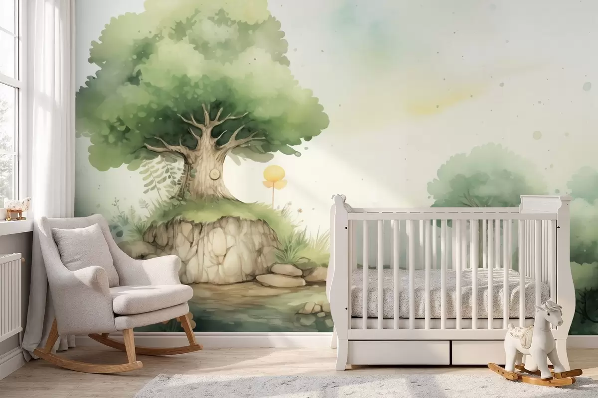 Murais de parede Um mundo de conto de fadas da infância em uma paisagem florestal verdejante, estilo aquarela Nr. w09566
