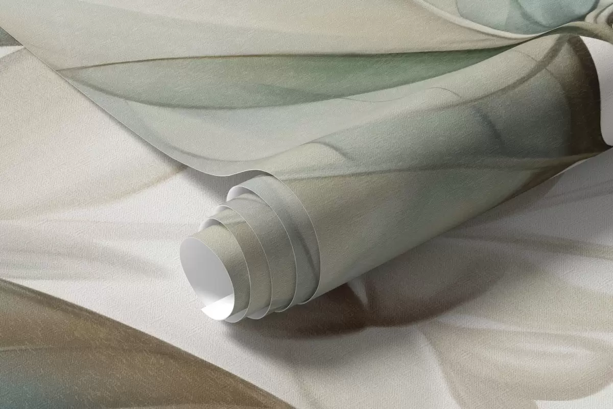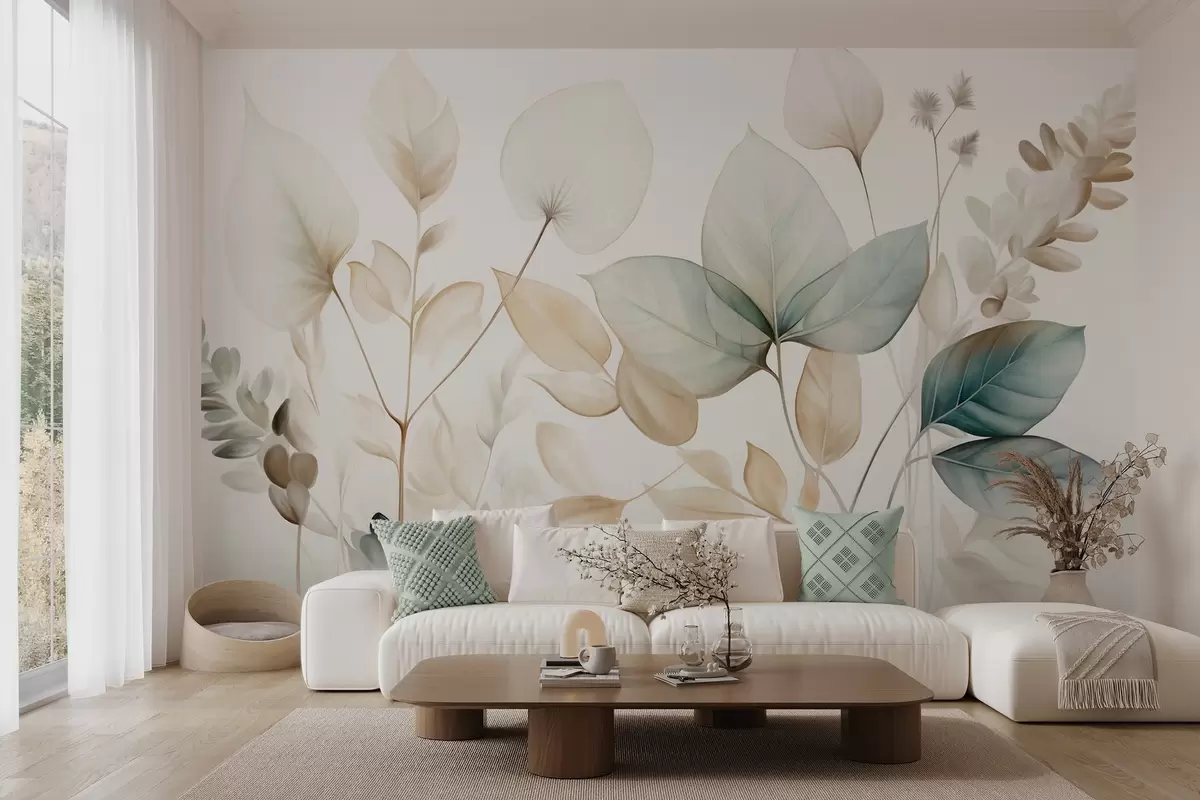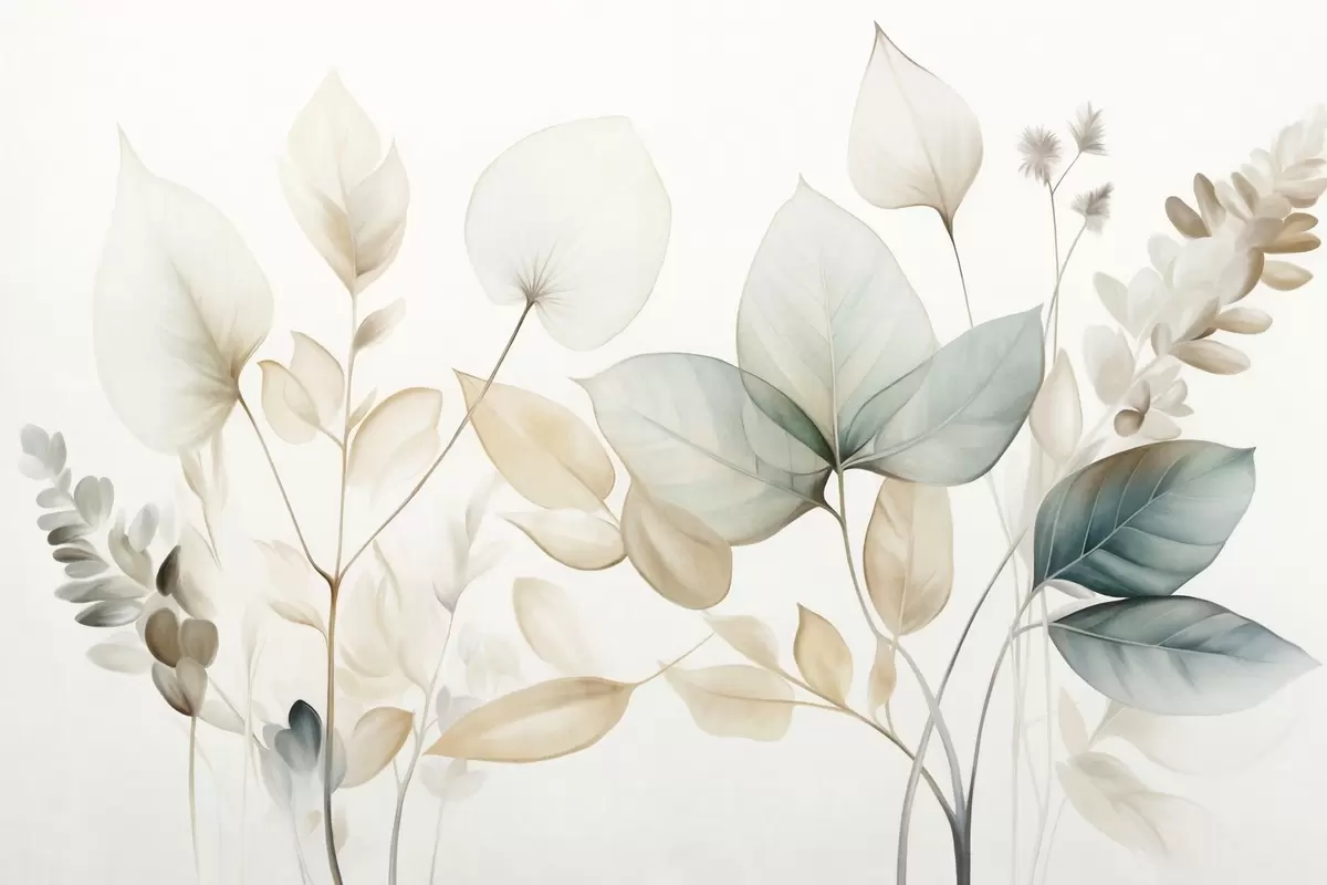 Murais de parede Folhas translúcidas texturizadas em tons suaves de bege e azul-petróleo, com hastes delicadas contra um fundo suave e claro. Nr. w09583