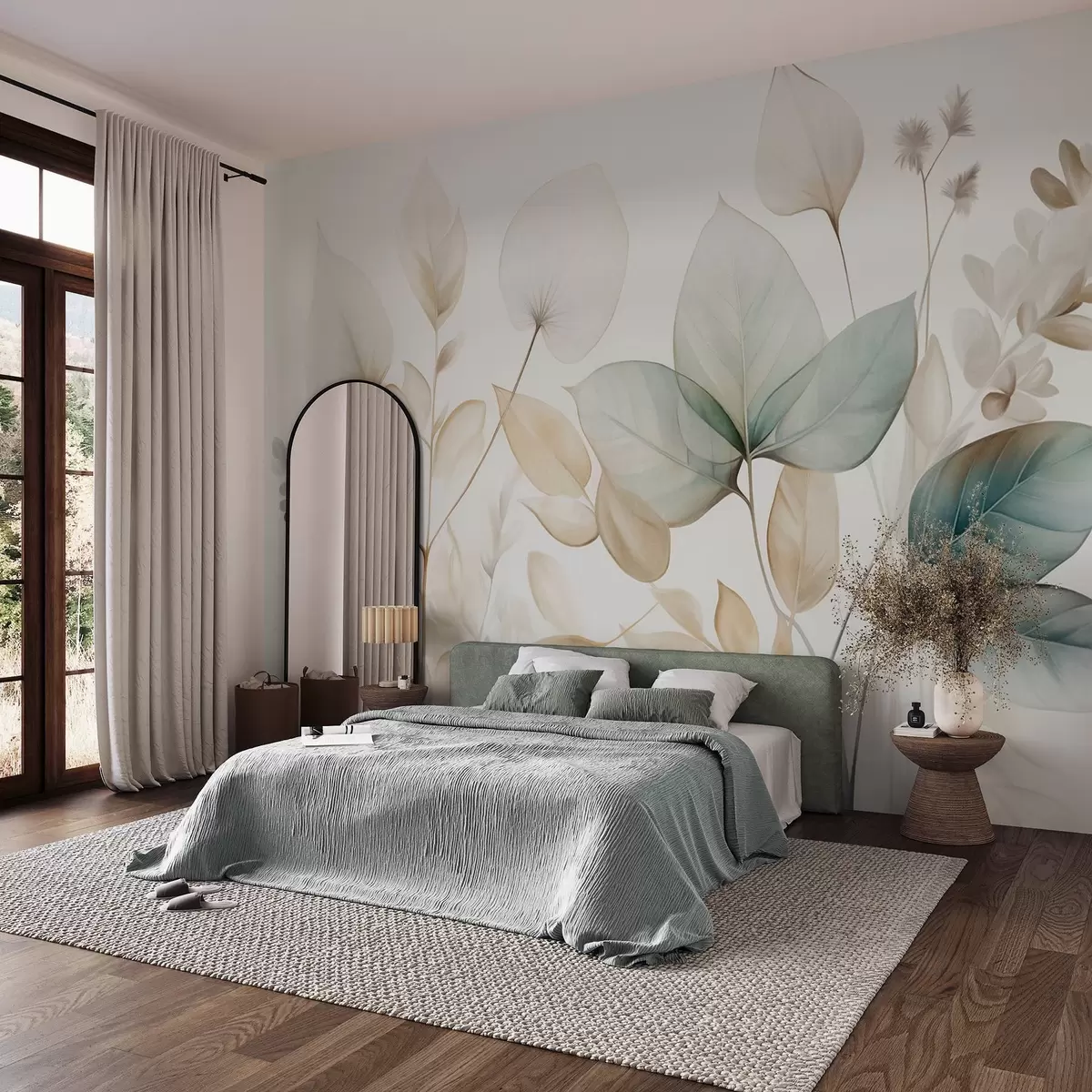 Murais de parede Folhas translúcidas texturizadas em tons suaves de bege e azul-petróleo, com hastes delicadas contra um fundo suave e claro Nr. w09583