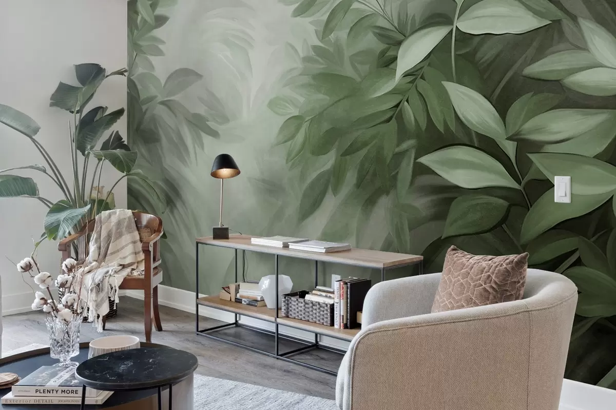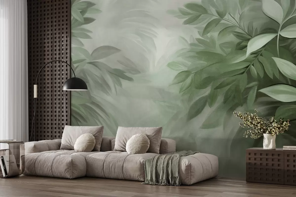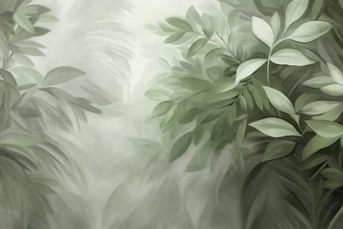 Murais de parede Folhas verdes e cinzentas com textura suave e difusa, num estilo pictórico com pinceladas visíveis. Nr. w09584v1