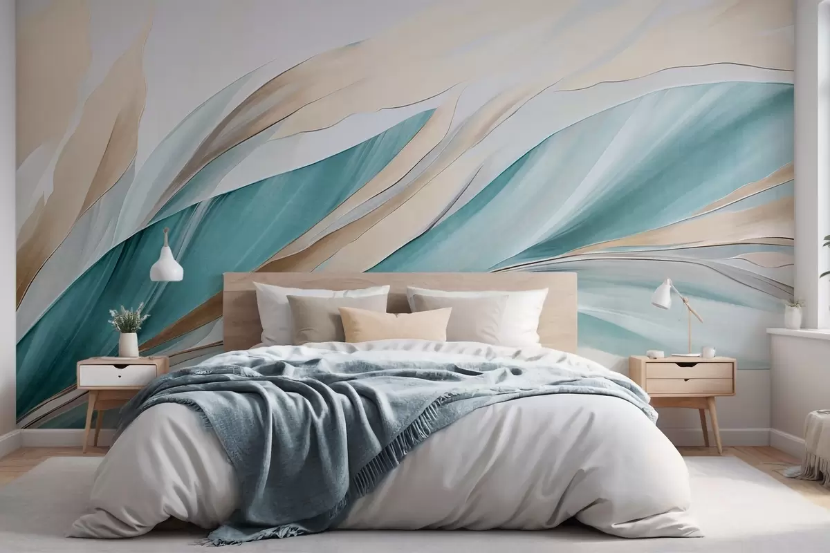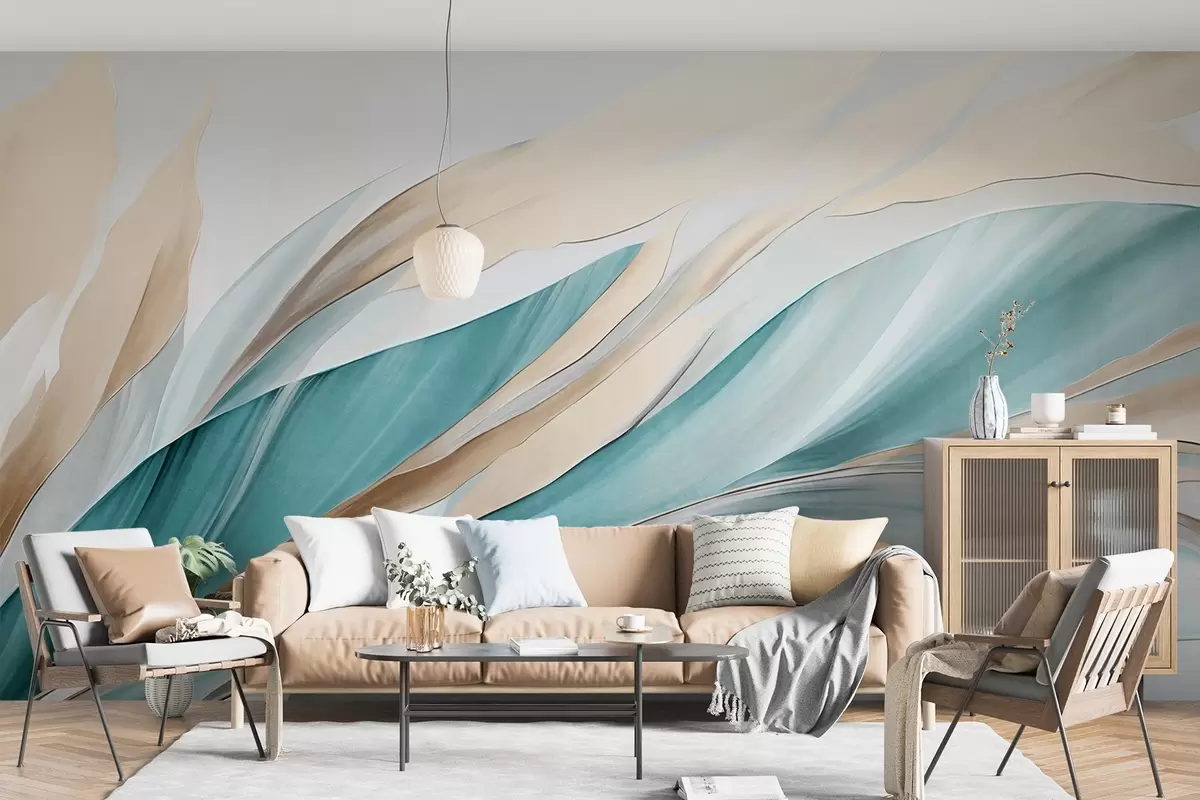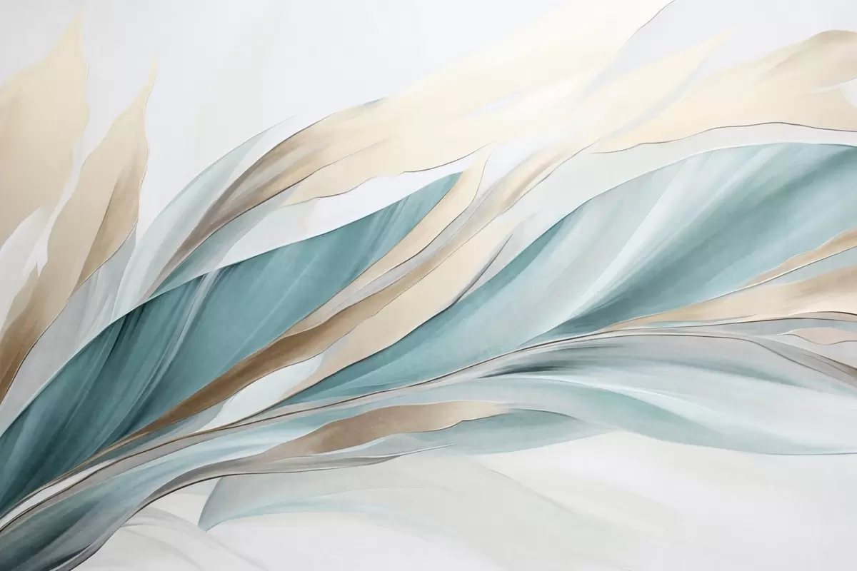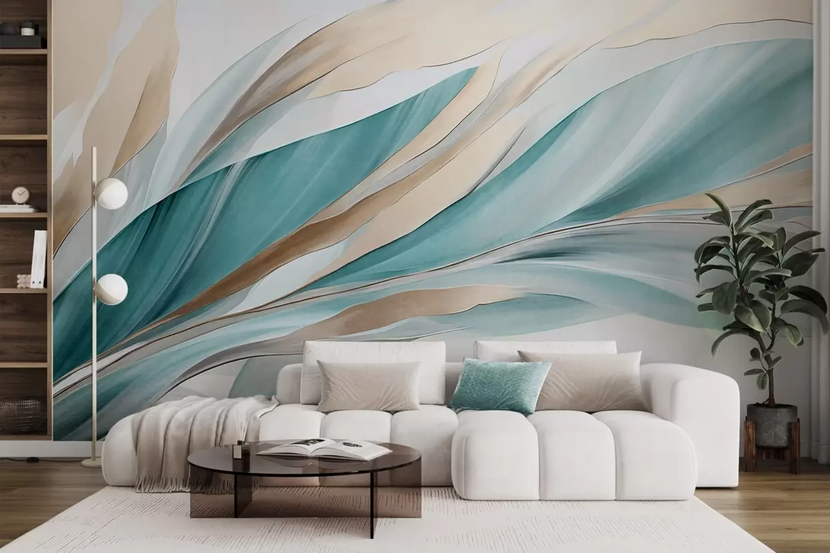 Murais de parede Ondas abstratas fluidas em tons de azul-petróleo e amarelo, com formas e linhas finas, sobre fundo branco, arte texturizada Nr. w09585