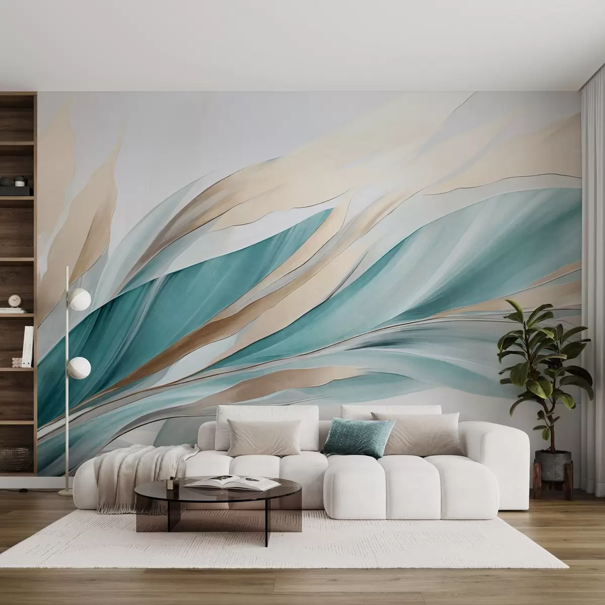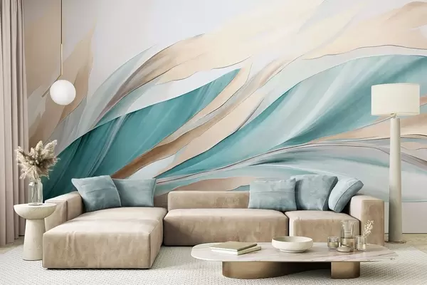 Murais de parede Ondas abstratas fluidas em tons de azul-petróleo e amarelo, com formas e linhas finas, sobre fundo branco, arte texturizada Nr. w09585