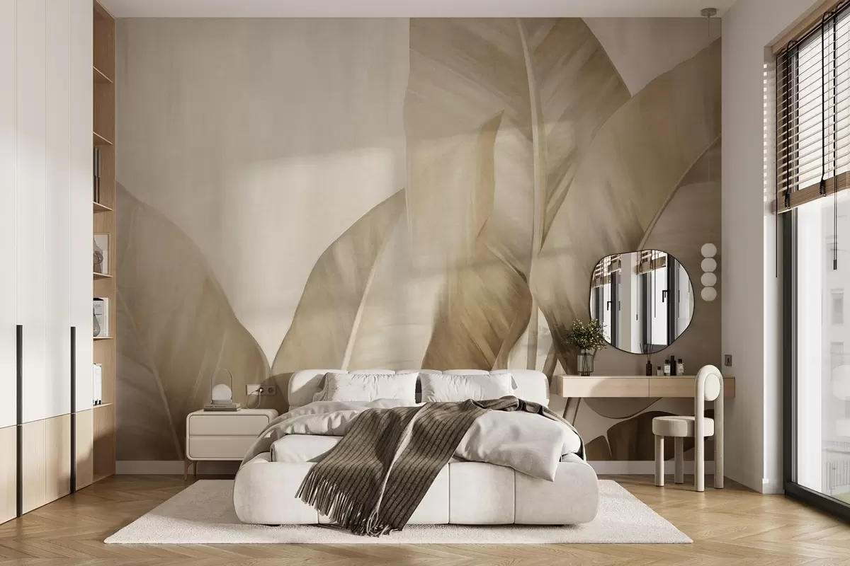 Murais de parede Folhas de bananeira grandes e texturizadas, em tom castanho claro, sobre um fundo bege claro, com uma estética suave e minimalista. Nr. w09586