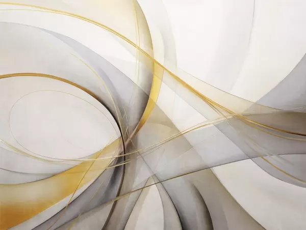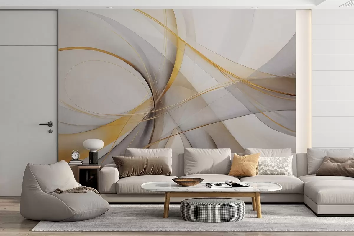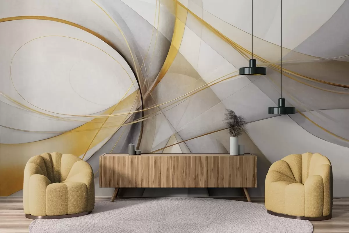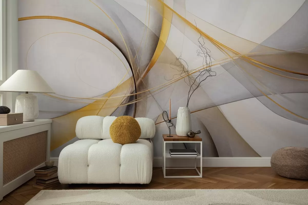 Murais de parede Linhas abstratas fluidas em amarelo e branco sobre fundo cinza, com sensação de movimento e profundidade, arte moderna Nr. w09587