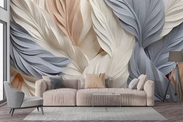 Murais de parede Penas abstratas e em camadas em tons de creme, bege e azul claro, com uma aparência texturizada e orgânica. Nr. w09603