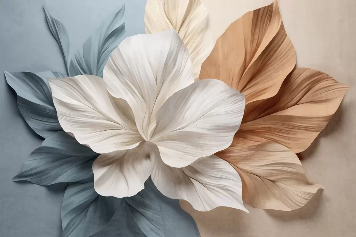 Murais de parede Flor abstrata com várias pétalas e folhas texturizadas em tons de pêssego e azul, fundo suave Nr. w09604