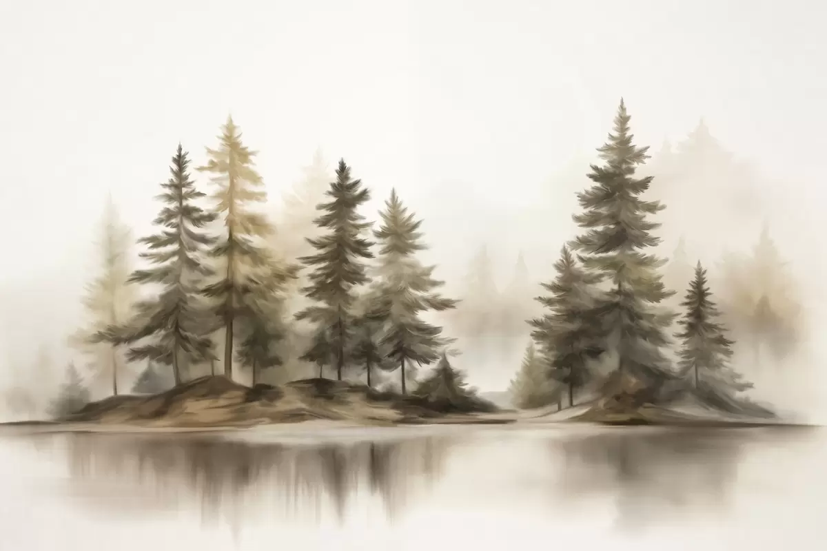 Murais de parede Uma floresta enevoada e texturizada com pinheiros altos pintados de forma realista Nr. w09610