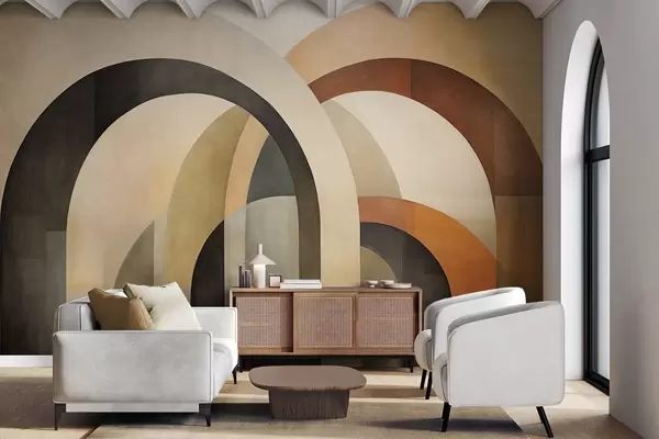Murais de parede Arcos geométricos abstratos texturizados em tons terrosos de bege, marrom e cinza, um design arquitetônico moderno em camadas. Nr. w09611