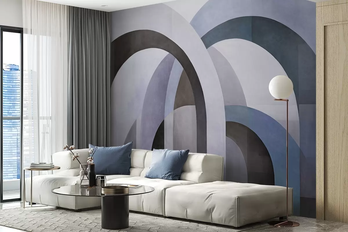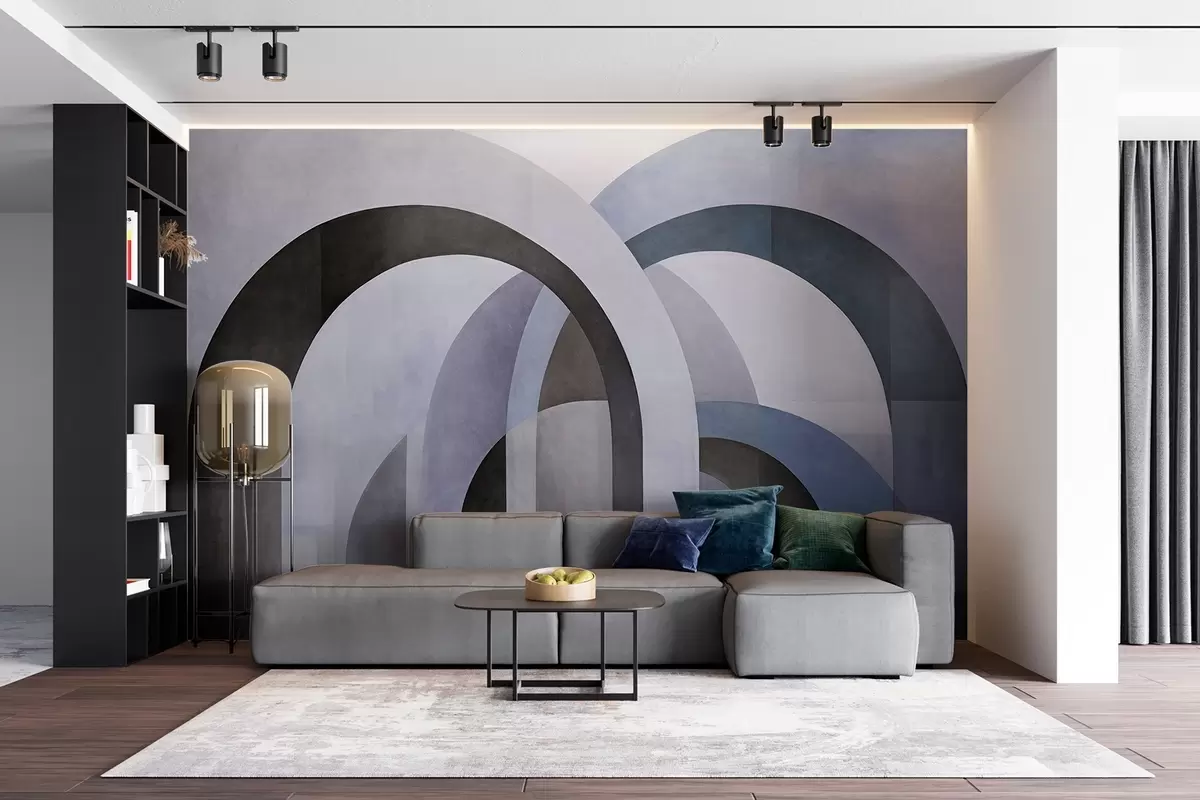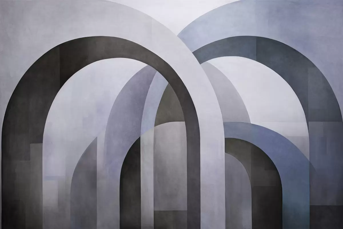 Murais de parede Arcos geométricos abstratos texturizados em tons de azul, preto e cinza, um design arquitetônico moderno em camadas Nr. w09611v1