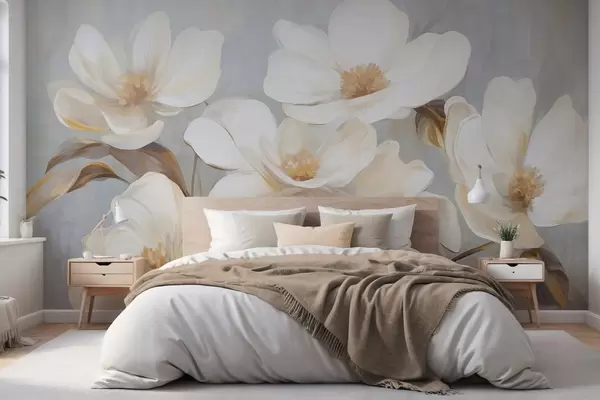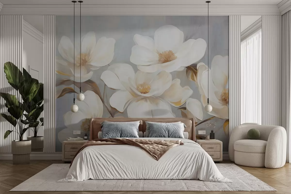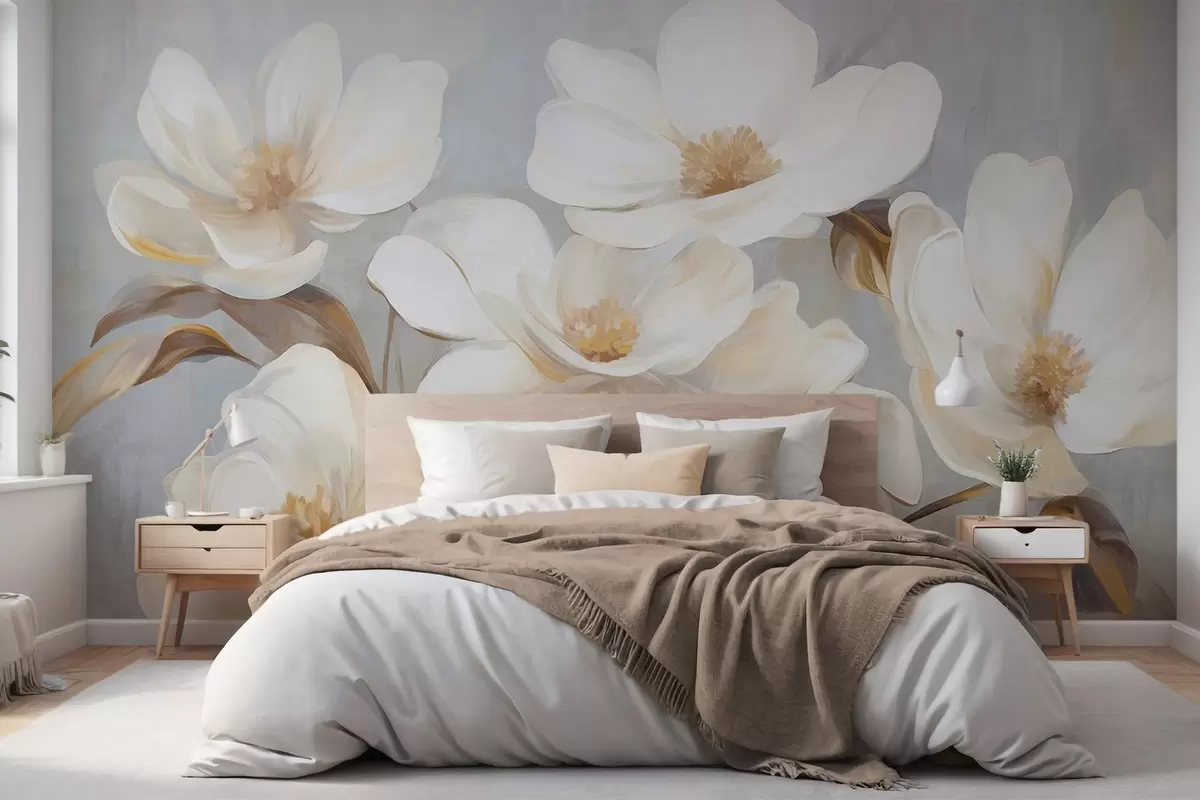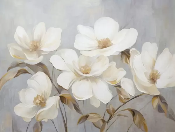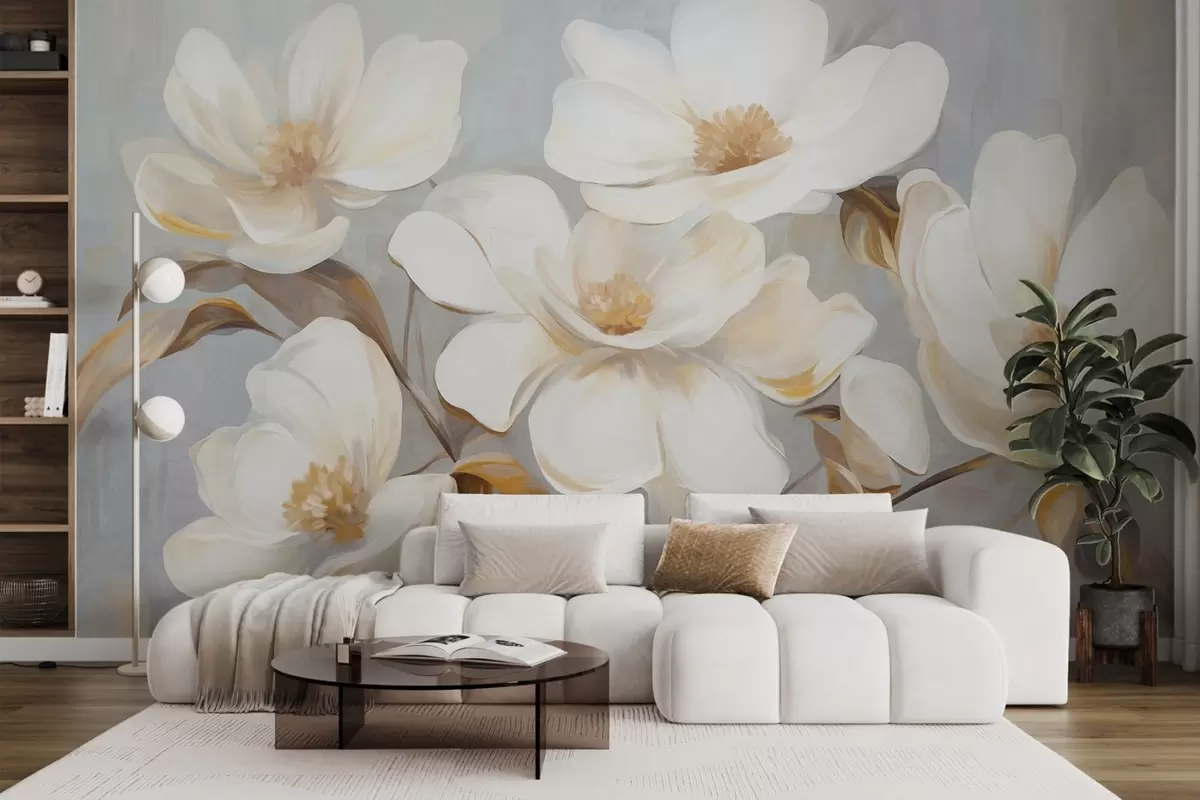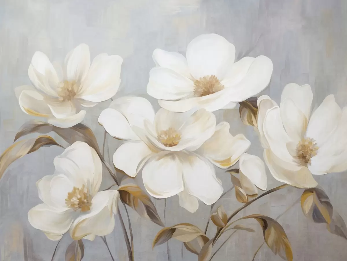 Murais de parede Uma pintura texturizada imitando várias flores brancas de magnólia contra um fundo pastel suave. Nr. w09612