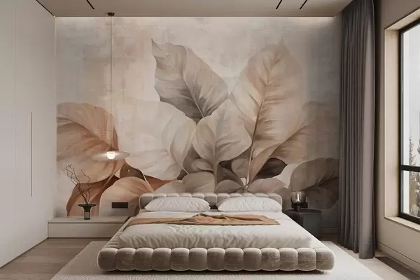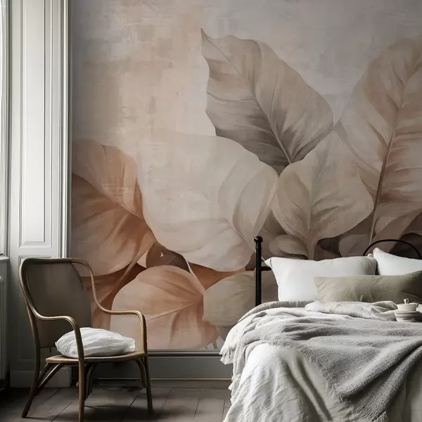 Murais de parede Pintura texturizada imitando folhas grandes e marrom-claras contra um fundo neutro com pinceladas sutis. Nr. w09614