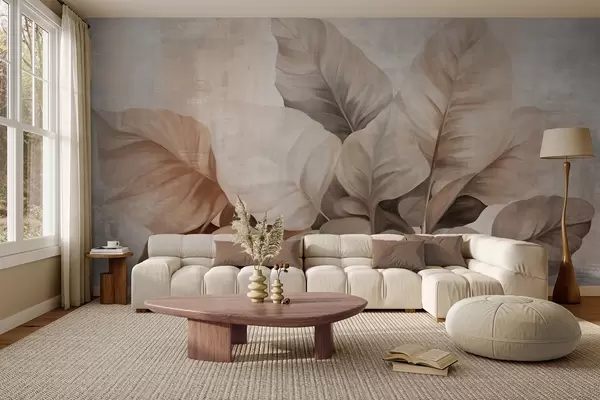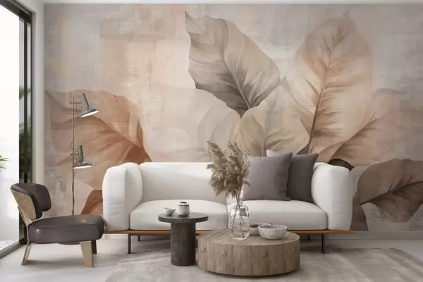 Murais de parede Pintura texturizada imitando folhas grandes e marrom-claras contra um fundo neutro com pinceladas sutis. Nr. w09614