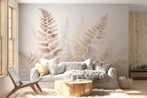 Murais de parede Folhas secas de samambaia texturizadas em vários tons de marrom, com um fundo suave e claro em estilo aquarela. Nr. w09615