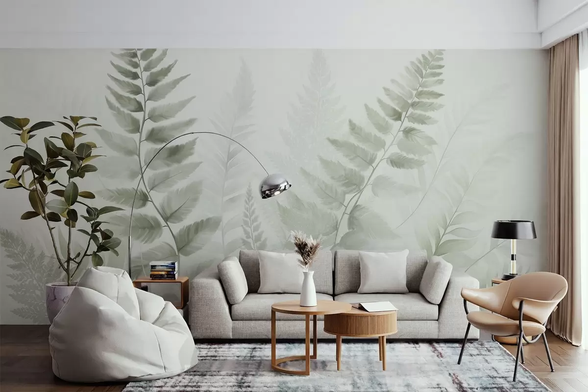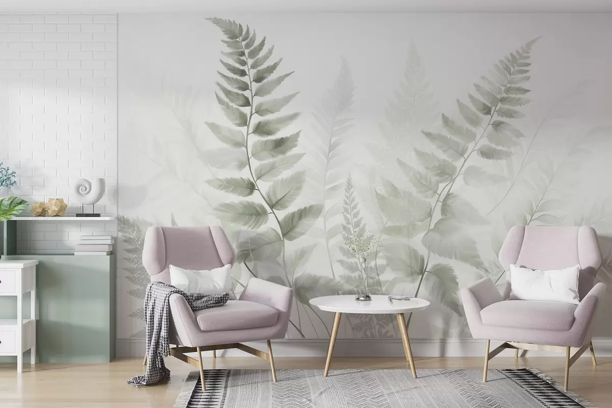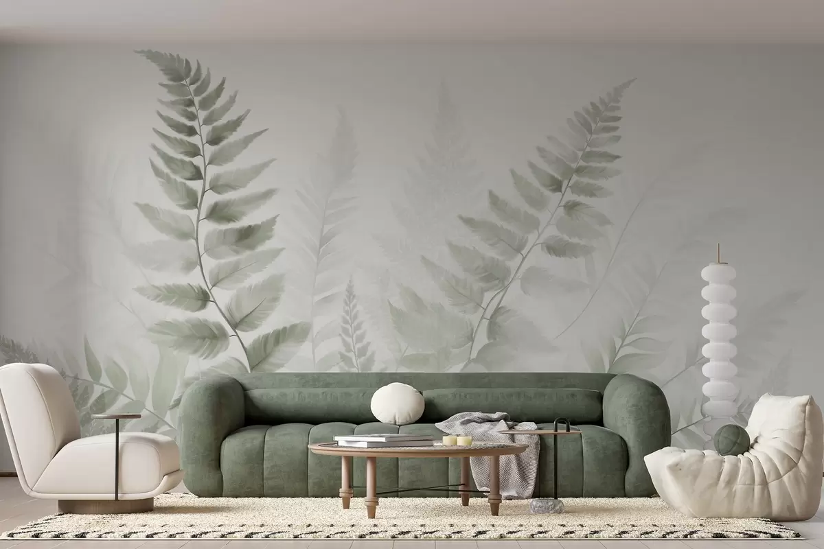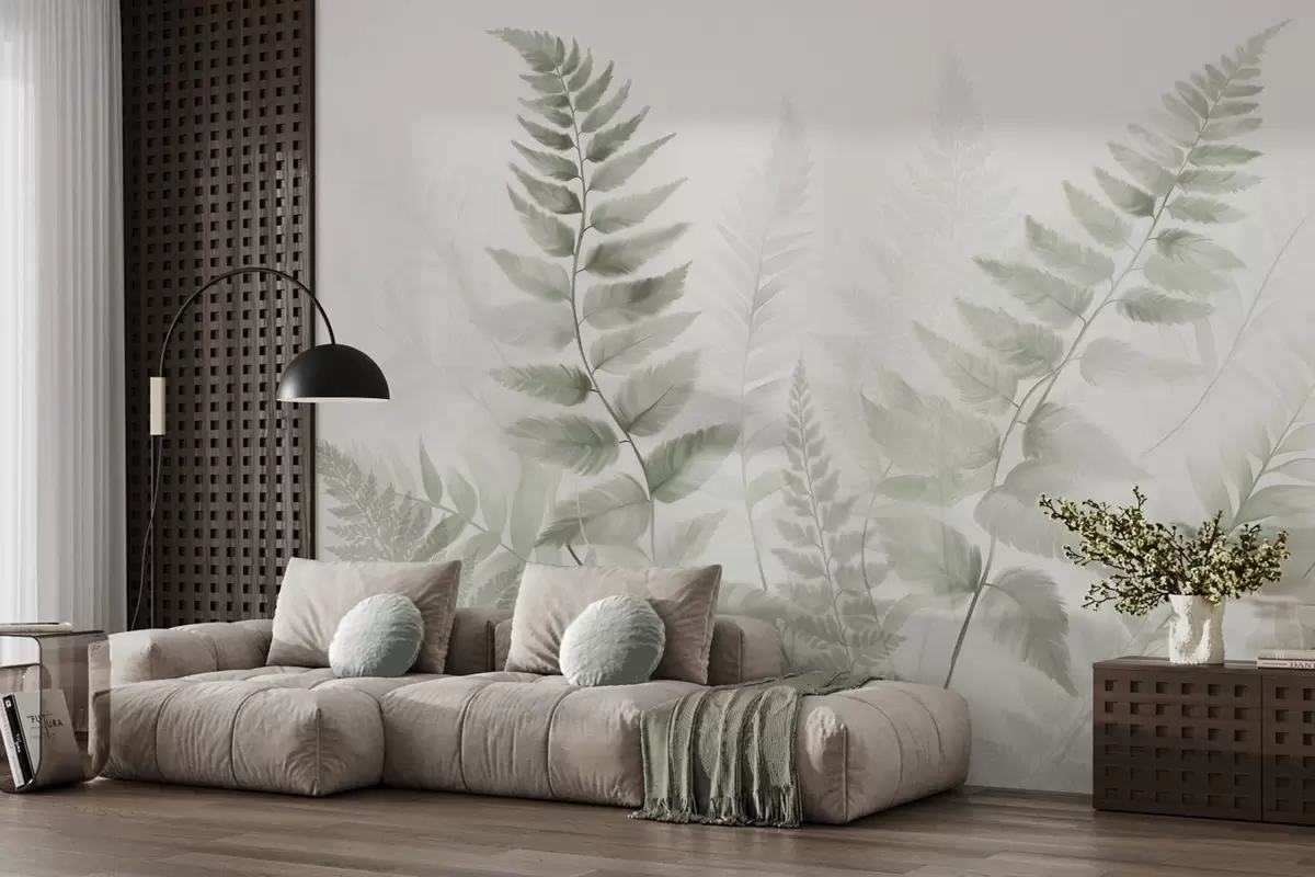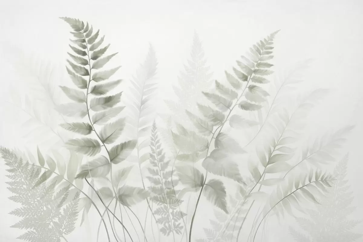 Murais de parede Folhas secas de samambaia texturizadas em vários tons de verde, com um fundo suave e claro em estilo aquarela. Nr. w09615v1