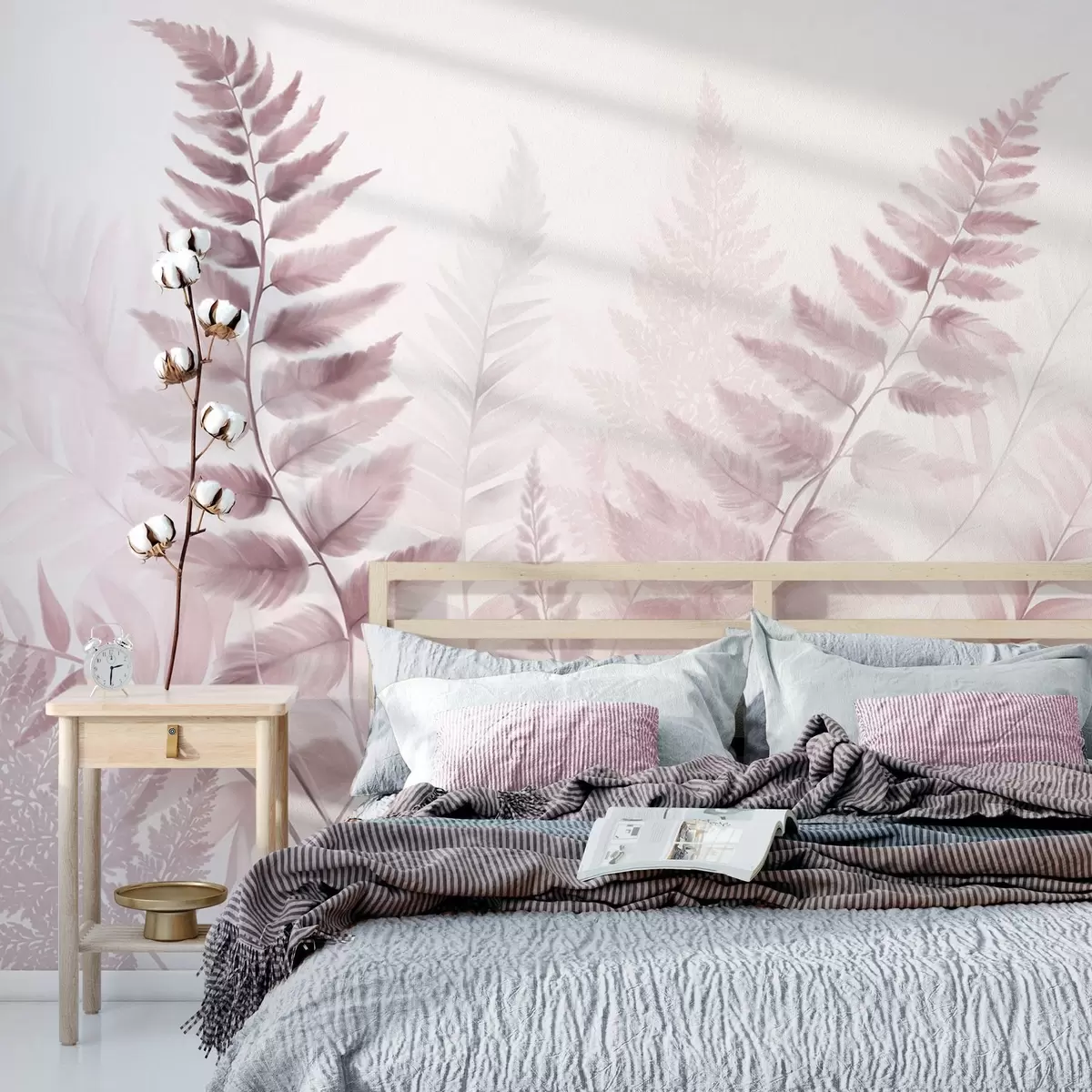 Murais de parede Folhas secas de samambaia texturizadas em vários tons de rosa, com um fundo suave e claro em estilo aquarela. Nr. w09615v2