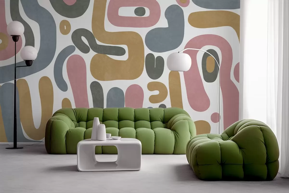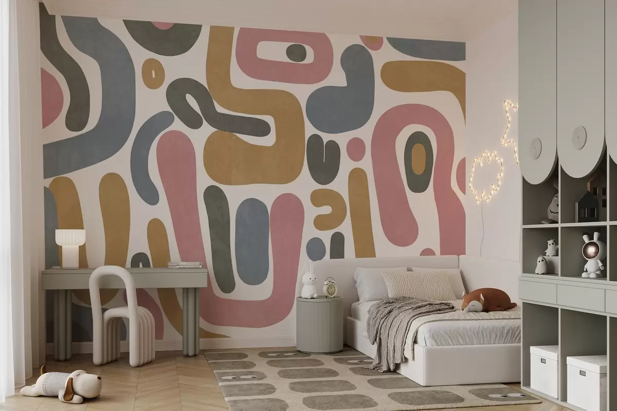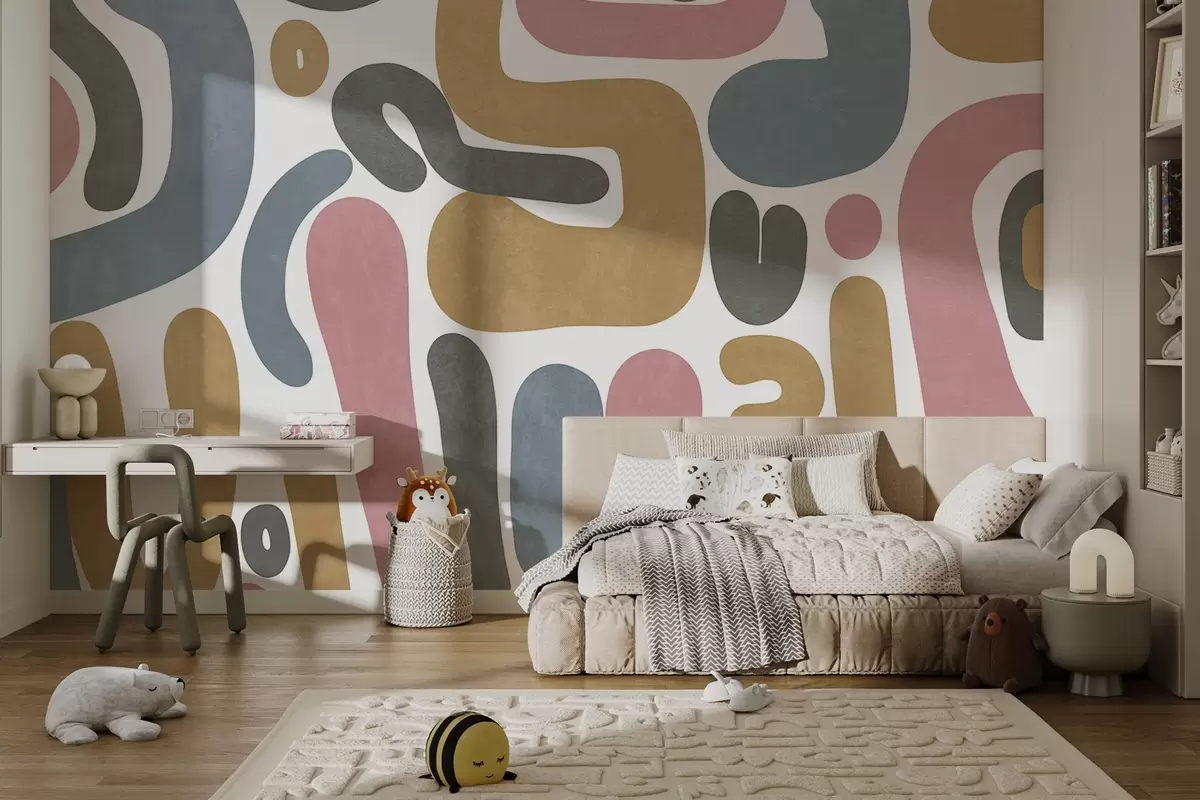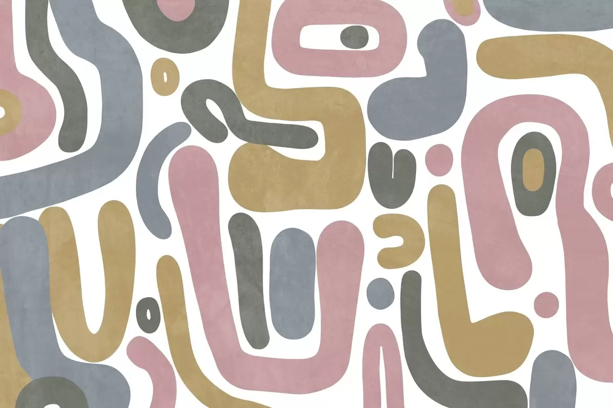 Murais de parede Formas abstratas texturizadas em rosa pastel, azul suave, amarelo mostarda e cinza sobre fundo branco arte moderna Nr. w09620