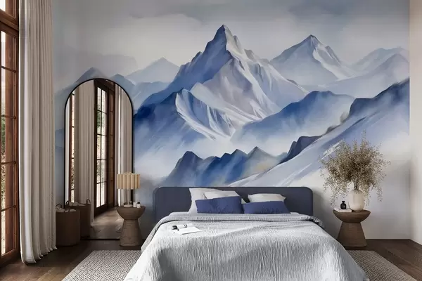 Murais de parede Montanhas nevadas texturizadas com um efeito suave de aquarela e uma paleta de azul e branco Nr. w09630