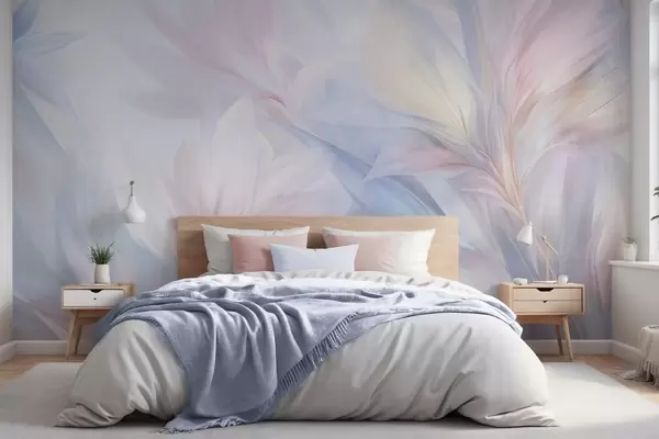 Murais de parede Folhas e penas suaves em tons pastel de rosa, azul e amarelo, com estampas abstratas e texturizadas. Nr. w09634