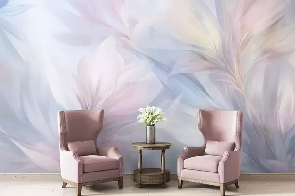 Murais de parede Folhas e penas suaves em tons pastel de rosa, azul e amarelo, com estampas abstratas e texturizadas. Nr. w09634